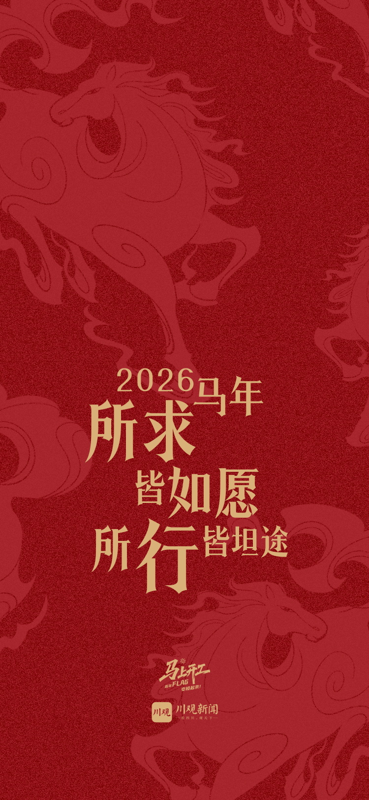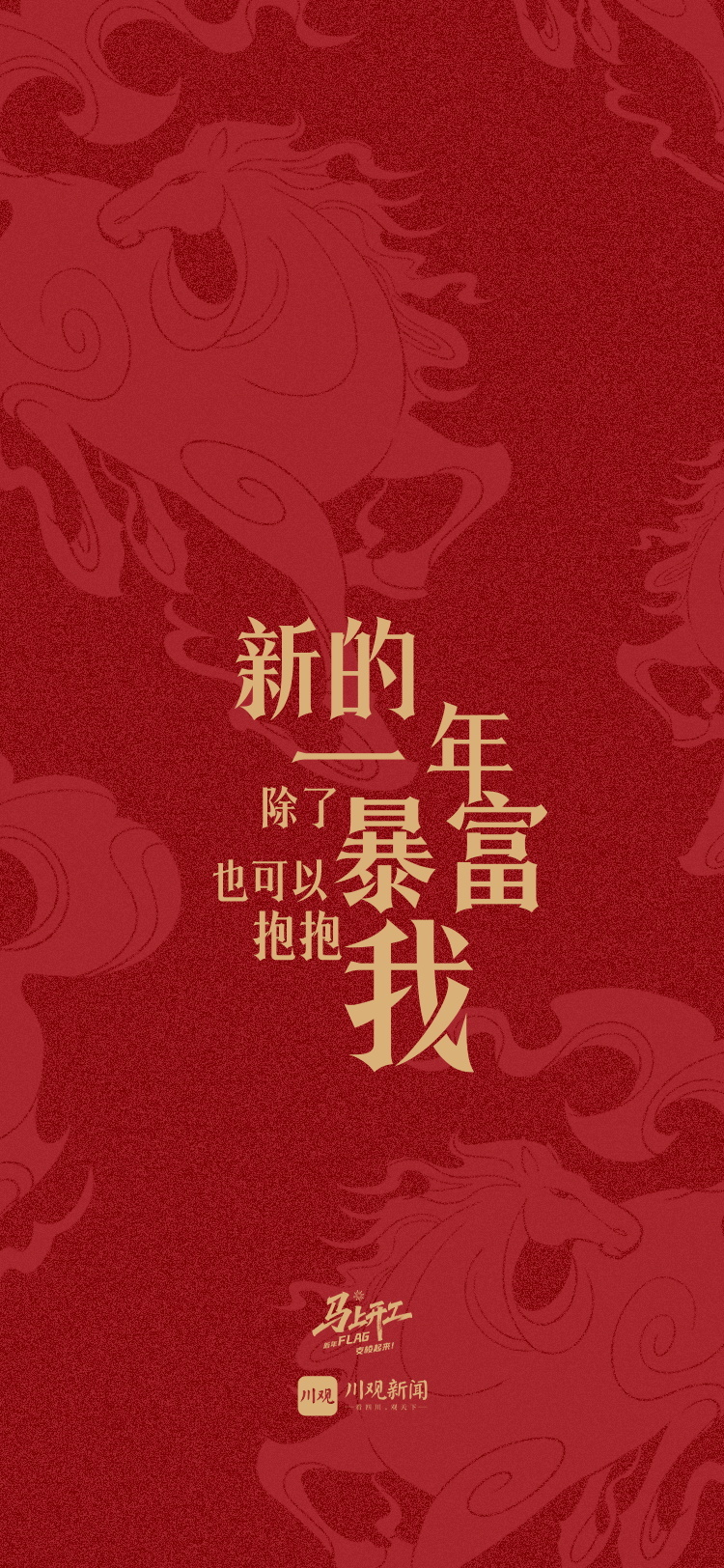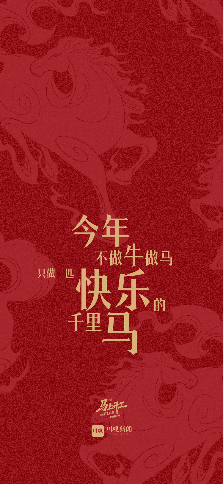 現在,活動雖已結束,但我們對用戶的祝福并未停止。為了讓這份開工的儀式感和馬年的奮斗動力常伴你左右,川觀新聞特別將大家的新年寄語與馬年元素相結合,精心設計制作成了一份專屬的新年禮物——“‘馬’上開工 · 新年FLAG”手機壁紙!