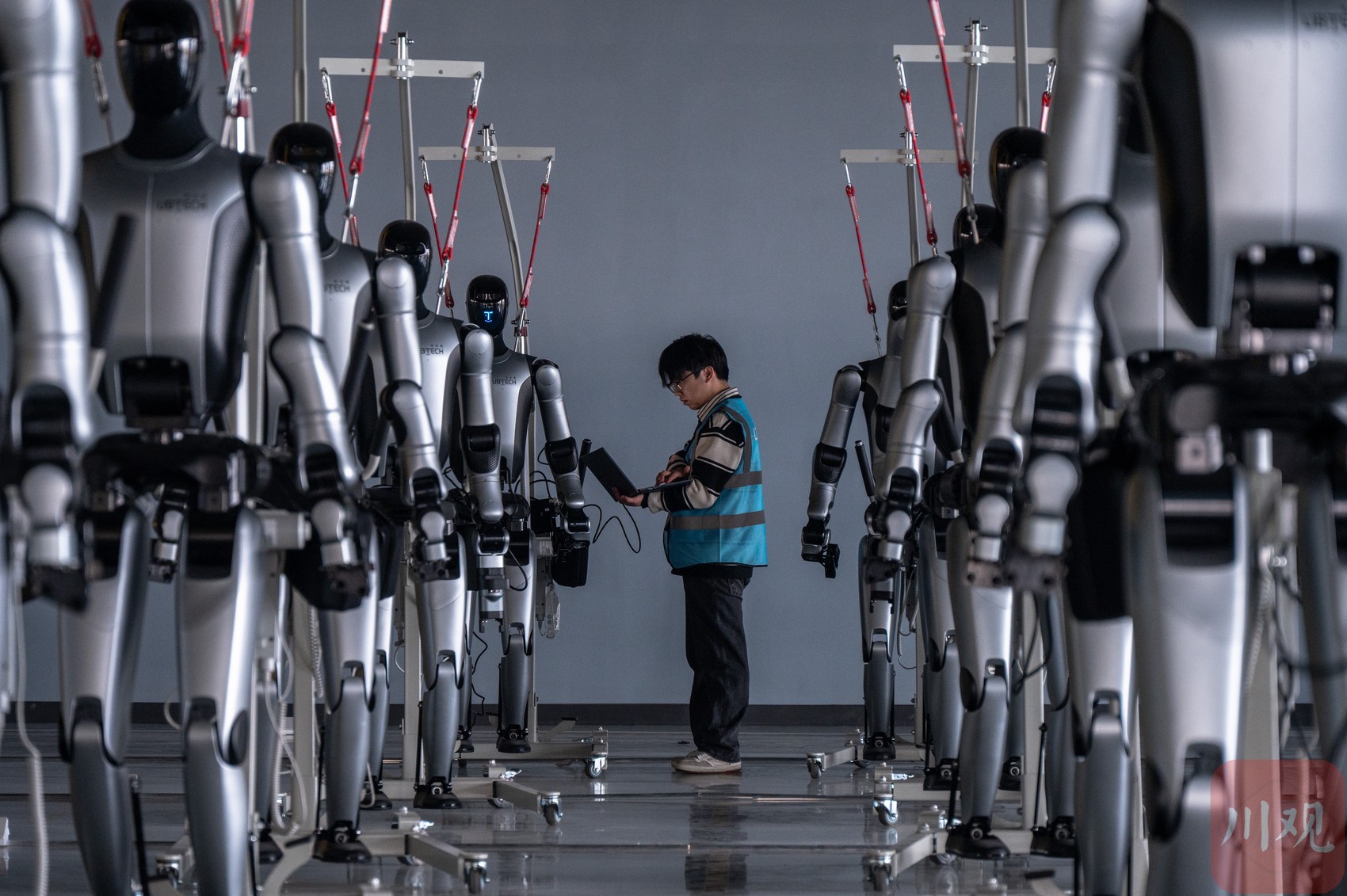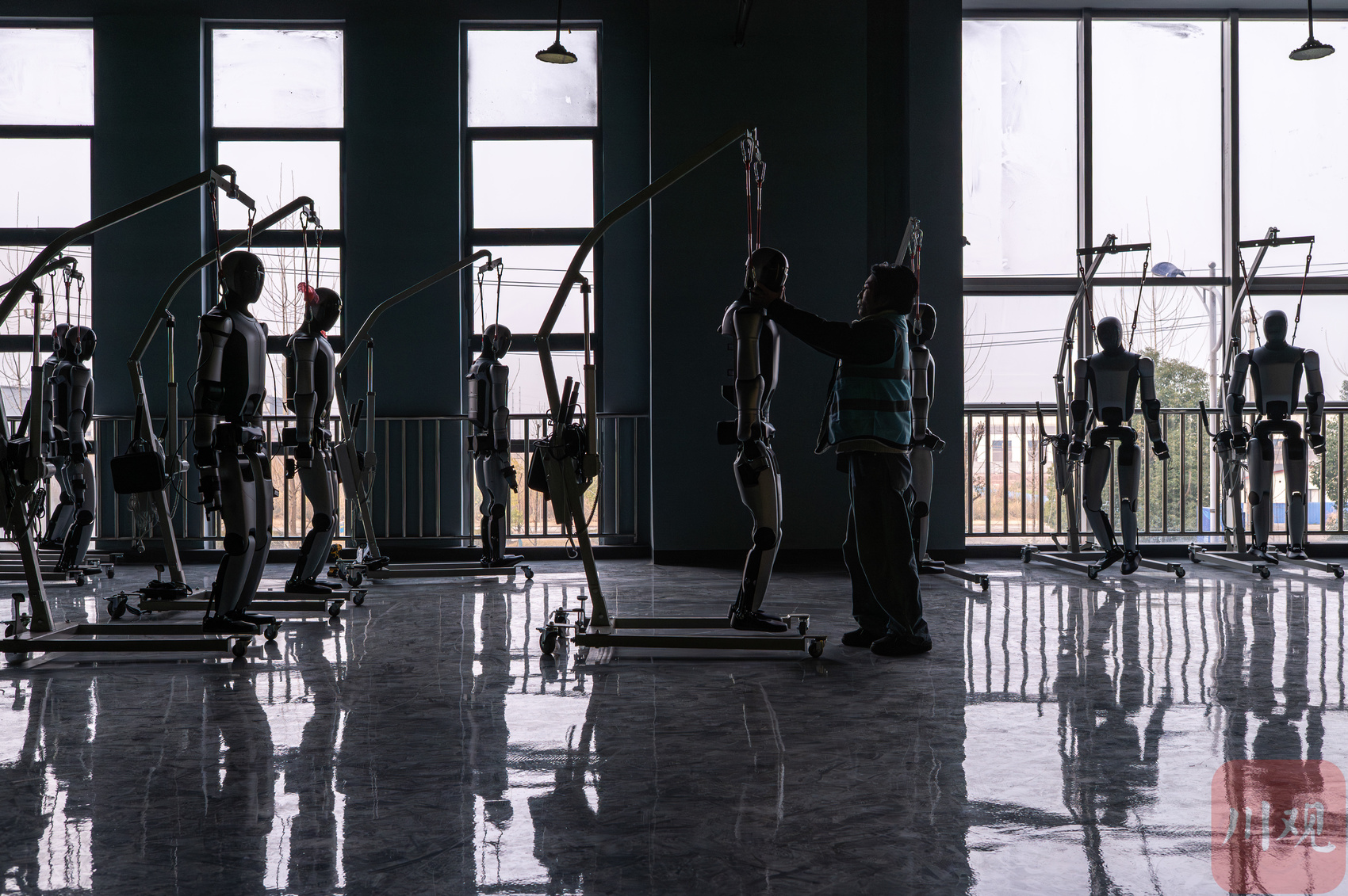 2月24日,春節假期后的第一個工作日,陽光灑進自貢機器人產業園內的四川人形機器人多模態數據采集測試中心(下稱數采中心)。上百臺“初出茅廬”的人形機器人整齊排列,等待出廠前的最后動作測試。記者探訪了這個位于自貢高新區、占地6000平方米的數采中心。