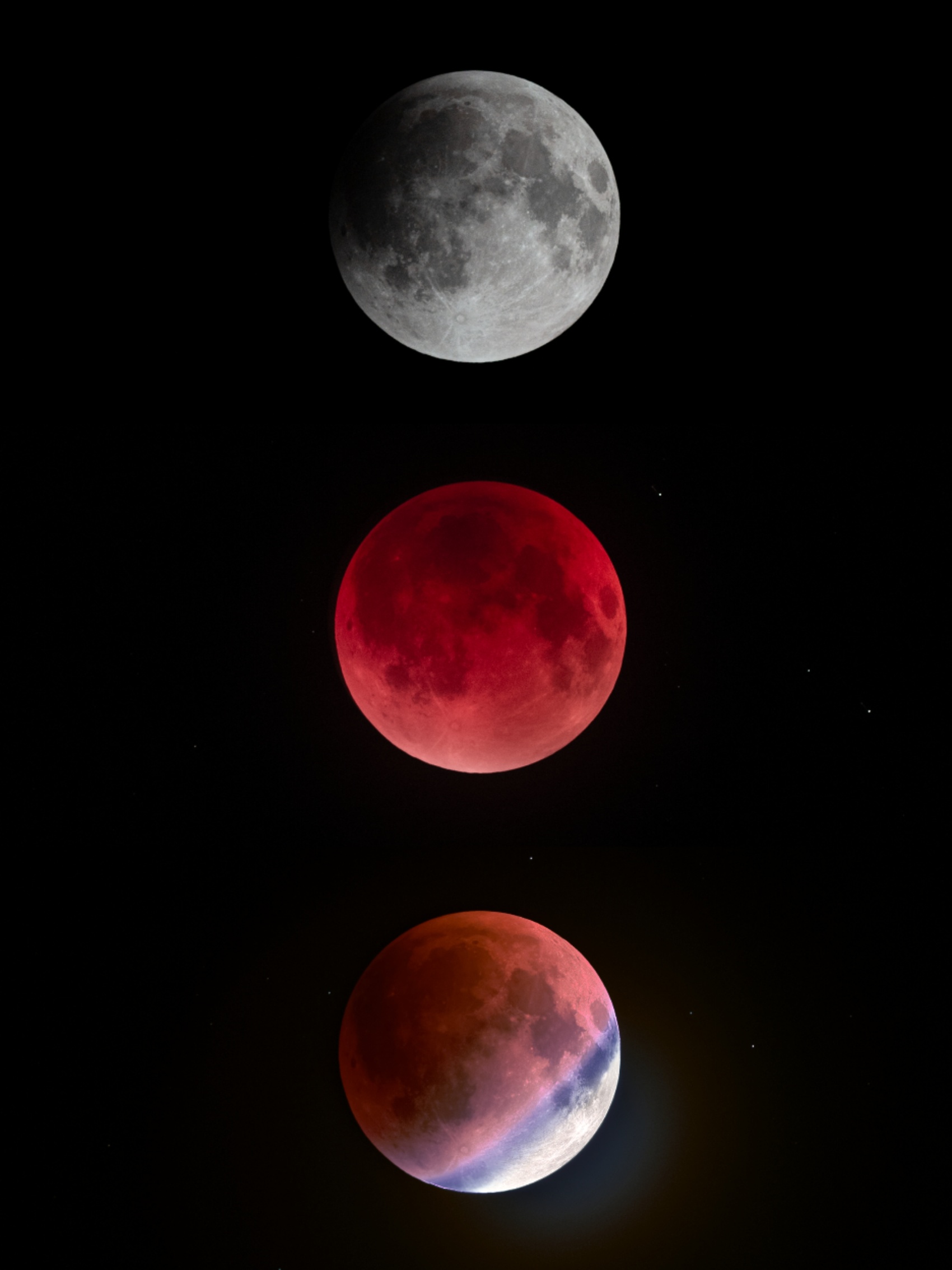 當月全食出現(xiàn)時,從地球上看去,整個月亮都呈現(xiàn)出古銅色,也就是大家所熟知的“紅月亮”。但“紅月亮”不是一蹴而就的,本次月全食主要分為初虧、食既、食甚、生光到復(fù)圓四大階段。
