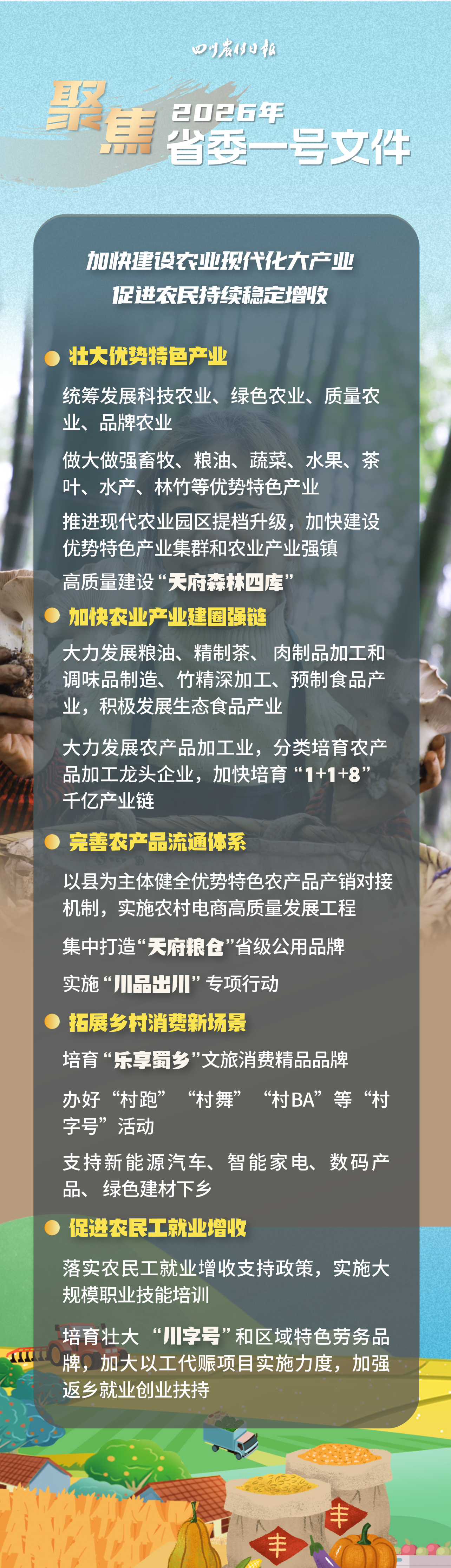 今年省委一號文件指出:加快建設(shè)農(nóng)業(yè)現(xiàn)代化大產(chǎn)業(yè),促進農(nóng)民持續(xù)穩(wěn)定增收。具體怎么做?看海報速覽。