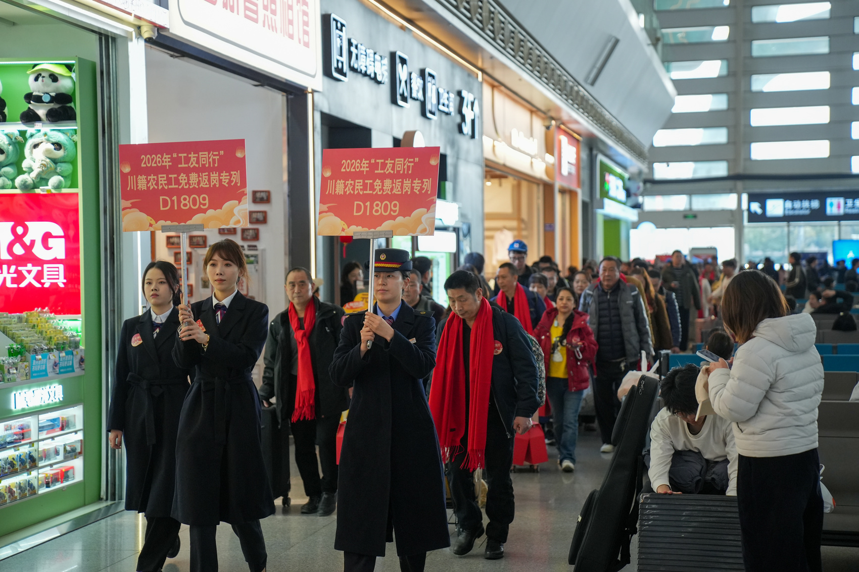 3月2日9時(shí)50分,140余名川籍務(wù)工人員搭乘D1809次列車從成都東站啟程,奔赴廣州南站。這是春節(jié)假期后,成都開(kāi)出的首趟務(wù)工人員返崗免費(fèi)專列。