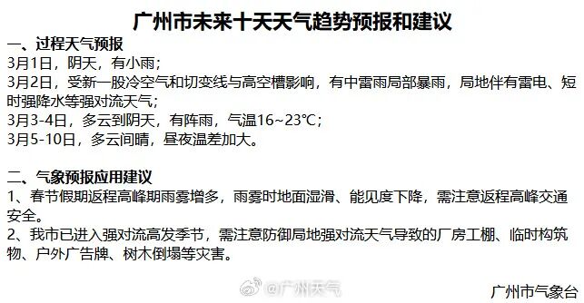 據@廣州天氣,受新一股冷空氣影響,今天(3月2日)廣州將有中雷雨局部暴雨,局地伴有短時大風、短時強降水等強對流天氣。恰逢開學第一天,氣象部門預計上學高峰期北部(從化、花都、白云)可能受雷雨影響,請學生和家長留意所在區域的最新預報預警情況。