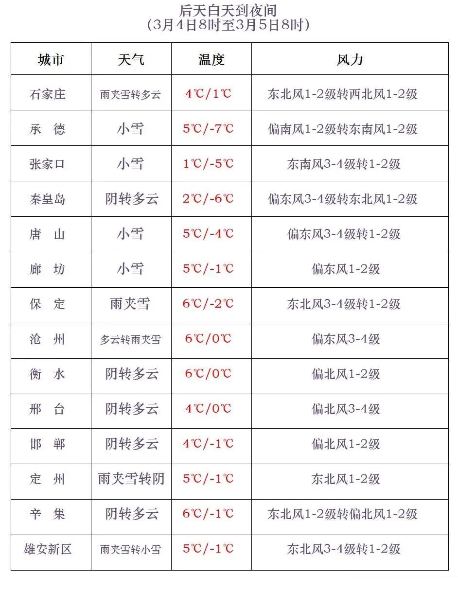 4日夜間到5日,全省陰,保定、廊坊以北地區有小雪,局地有中雪,其他地區有零星小雪或雨夾雪。