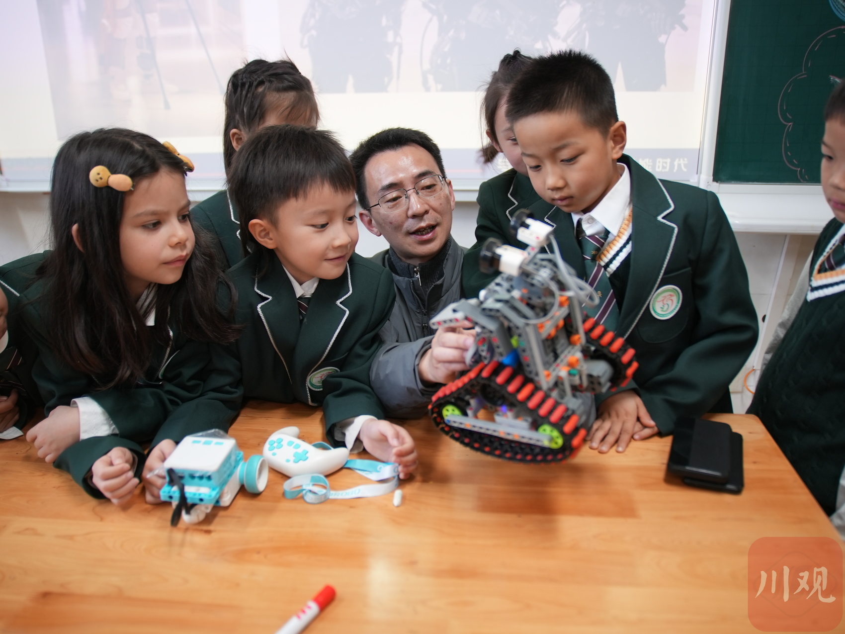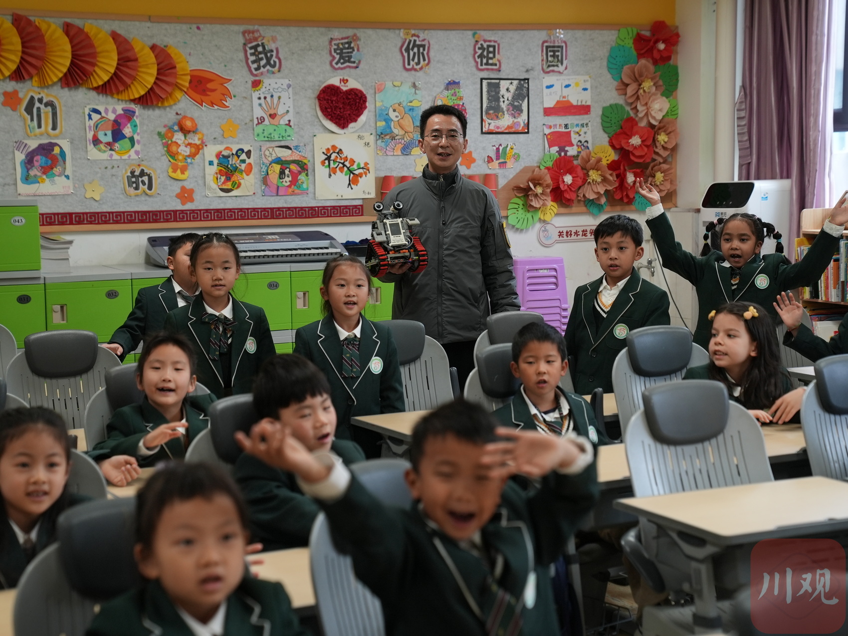 當(dāng)天,一年紀(jì)9班的一位學(xué)生家長(zhǎng)帶著機(jī)器人走進(jìn)校園,用視頻展示了機(jī)器人在生活服務(wù)、應(yīng)急救援中的真實(shí)用途,還讓孩子們摸一摸、看一看,了解機(jī)器人的 “小秘密”。在課堂上,這位家長(zhǎng)還分享了四川本土科創(chuàng)學(xué)子的成長(zhǎng)故事,鼓勵(lì)小朋友們保持好奇心,敢想敢試,未來(lái)做真正的科創(chuàng)小達(dá)人。