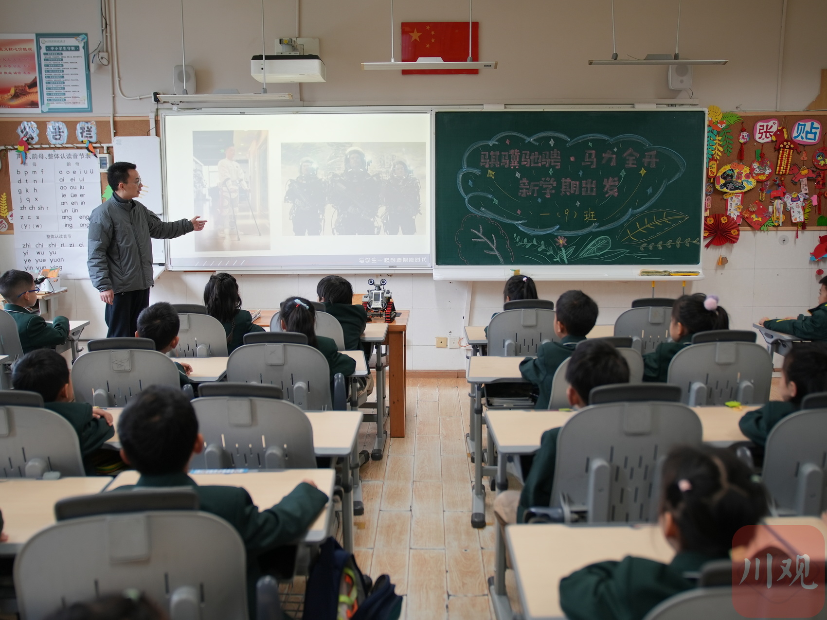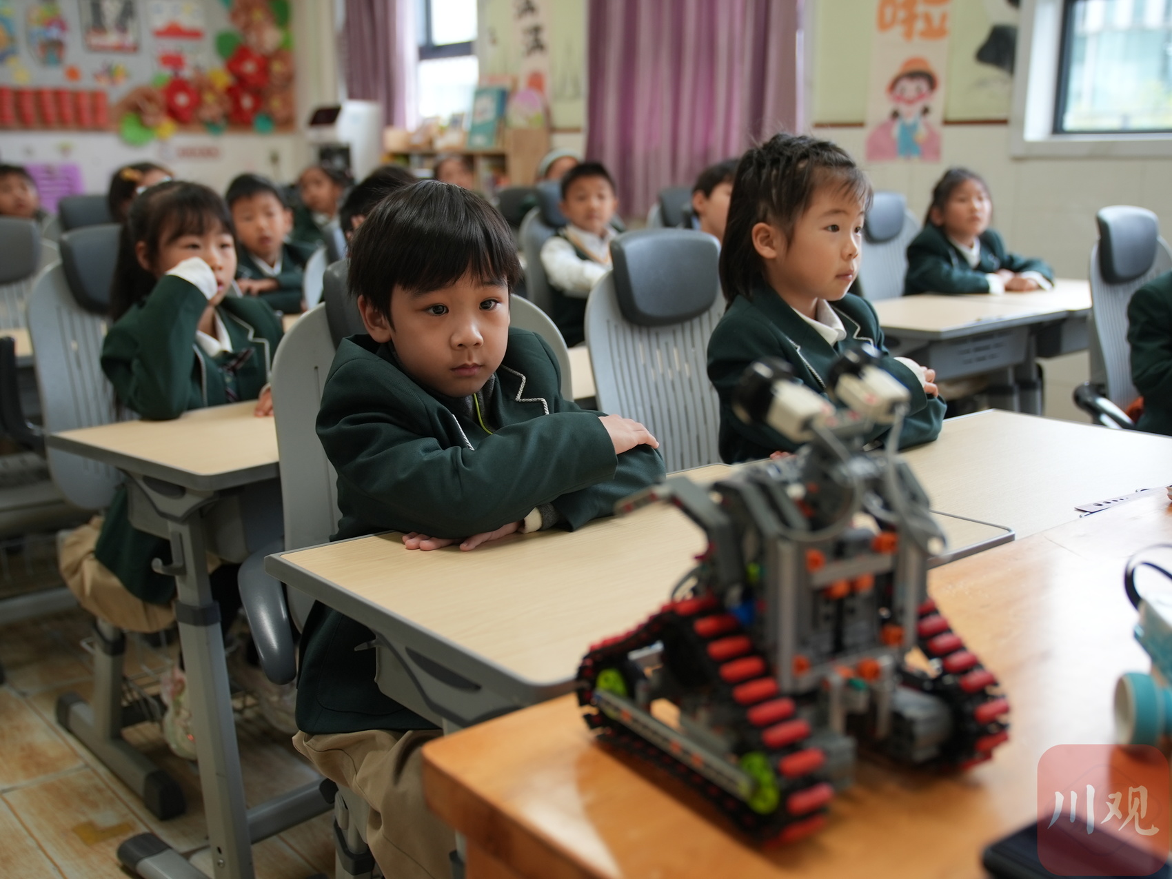 開(kāi)學(xué)第一課上,小學(xué)生對(duì)機(jī)器人目不轉(zhuǎn)睛。