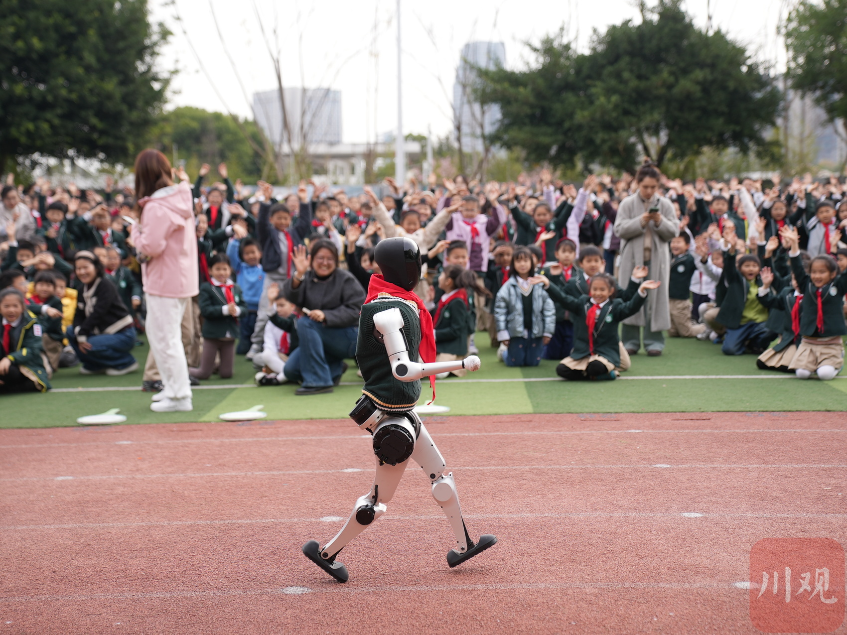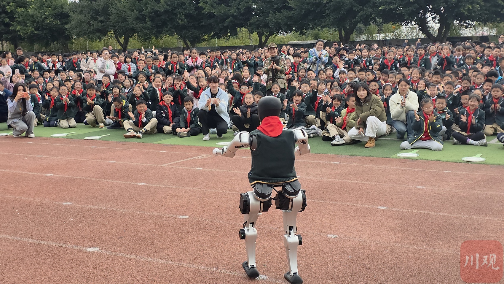 本次開(kāi)學(xué)第一課,學(xué)校特別邀請(qǐng)四川省青少年科技教育協(xié)會(huì)現(xiàn)場(chǎng)助陣。靈活的機(jī)器人整齊列隊(duì)、完成各種高難度動(dòng)作,引得全場(chǎng)尖叫不斷。在互動(dòng)環(huán)節(jié),孩子們紛紛親手嘗試操縱機(jī)器狗,與人形機(jī)器人近距離握手互動(dòng),感受科技帶來(lái)的快樂(lè)。