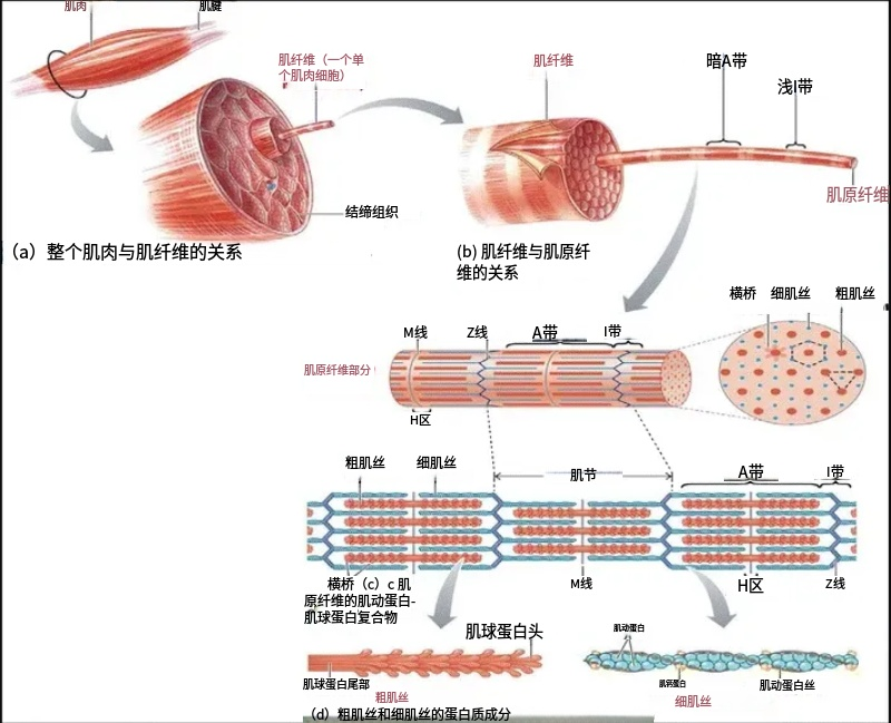 當許多肌纖維同時收縮時,整個肌束的長度減短、張力增加;多個肌束協(xié)同作用,則讓整塊肌肉收緊,最終通過肌腱牽拉骨骼,讓身體動起來。