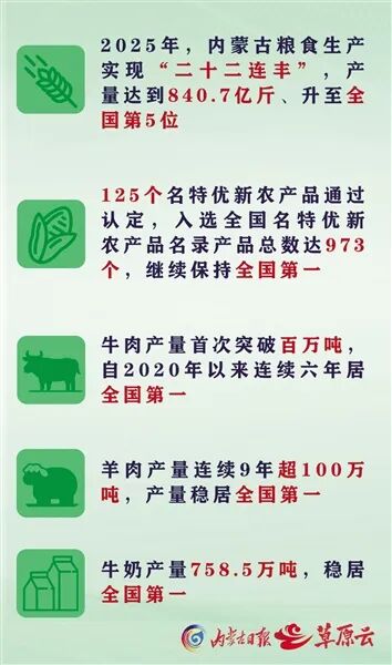 從河套平原的繁忙備耕到錫林郭勒草原的牛羊成群,再到敕勒川的奶香四溢,內蒙古以“糧倉”更實、“肉庫”更足、“奶罐”更豐的堅實底氣,扛起建設國家重要農畜產(chǎn)品生產(chǎn)基地的使命擔當。