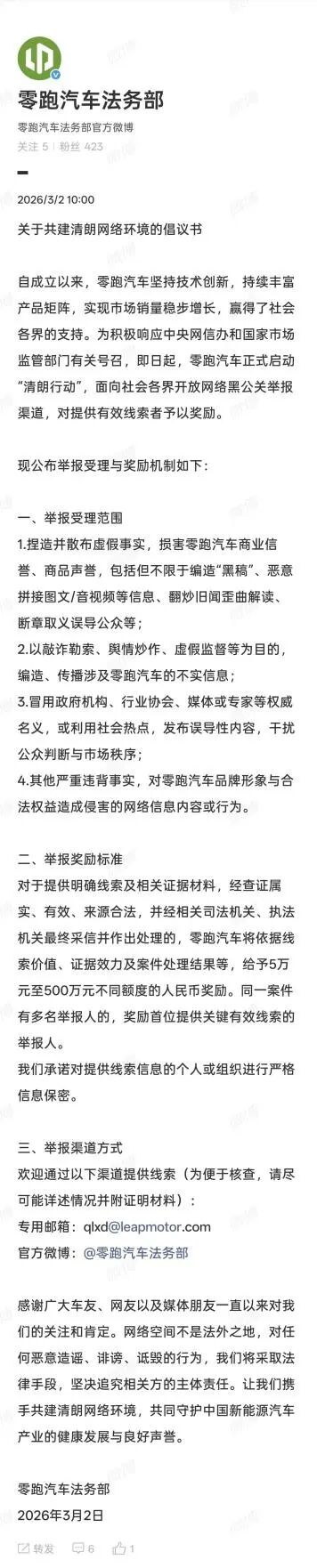 3月2日,零跑正式啟動“清朗行動”,并發布《關于共建清朗網絡環境的倡議書》。面向社會各界開放網絡黑公關舉報渠道,推出高額懸賞追責機制,以實際行動向行業不良風氣說“不”。