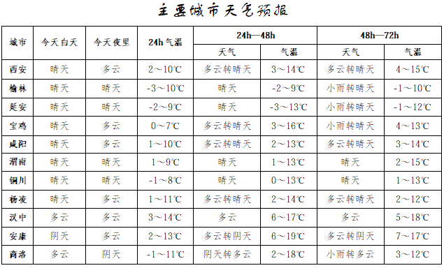 今天晚上:全省多云間陰天,陜北部分地方有小雪或雨夾雪(0.1~3毫米)。