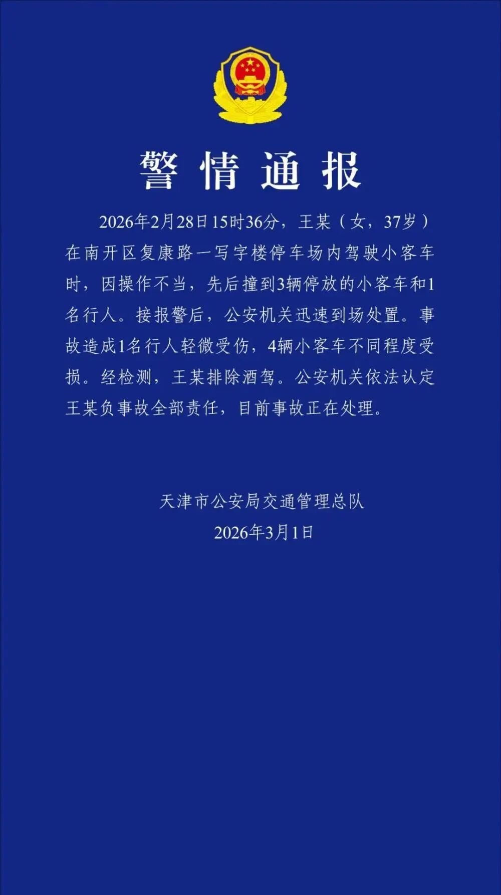 2026年2月28日15時36分,王某(女,37歲)在南開區(qū)復(fù)康路一寫字樓停車場內(nèi)駕駛小客車時,因操作不當(dāng),先后撞到3輛停放的小客車和1名行人。