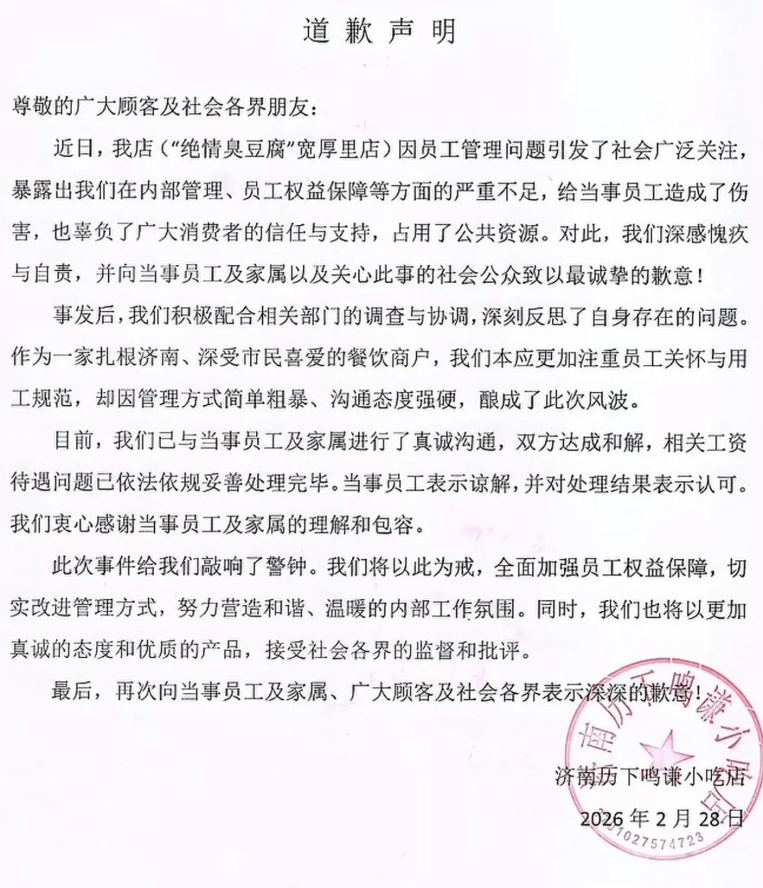 2月28日,濟南市歷下區人力資源和社會保障局維權服務一部負責人接受采訪稱,該單位約談涉事商家,向員工家屬核實,就工資發放、加班費核算、辭退手續等問題進行調查,雙方簽署協議達成和解。當日,涉事商家通過社媒賬號發布道歉聲明,向當事員工及家屬、關心此事的社會公眾道歉,相關的工資待遇問題已得到妥善處理。聲明稱,因管理方式簡單粗暴、溝通態度強硬,造成了本次風波。李女士則通過社媒賬號發布聲明稱,父親與涉事店面解除勞動關系,向北京韓紅愛心慈善基金會捐贈部分賠款29061.5元。