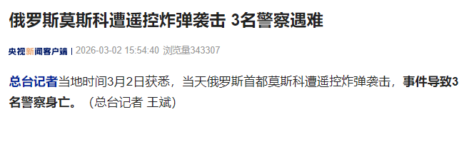總臺記者當地時間3月2日獲悉,當天俄羅斯首都莫斯科遭遙控炸彈襲擊,事件導致3名警察身亡。