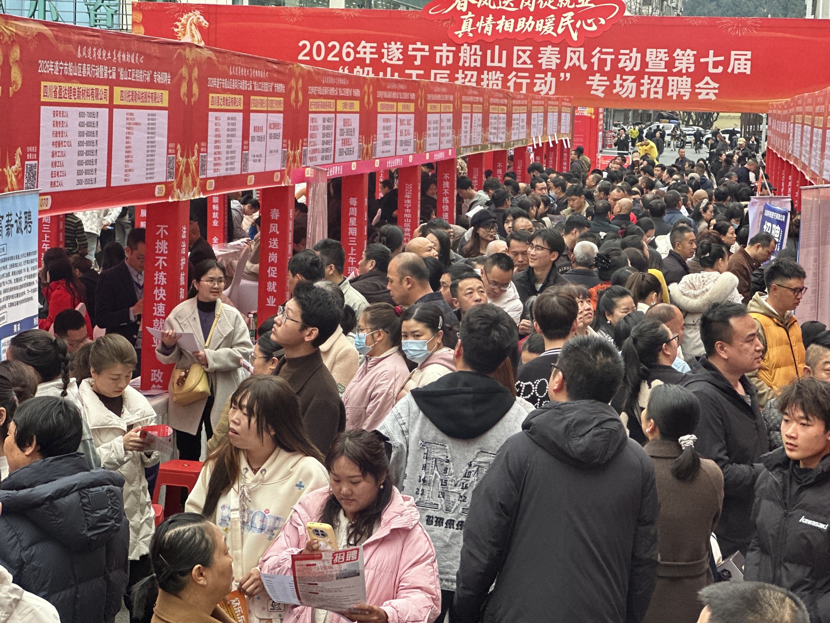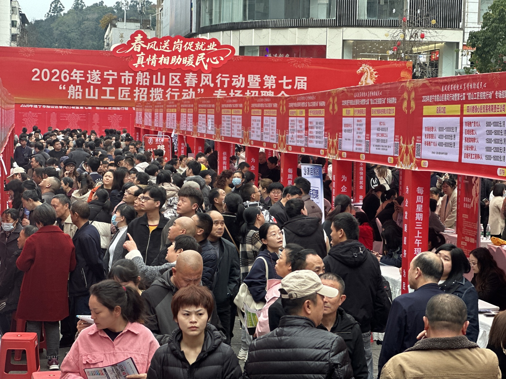 日前,2026年春風(fēng)行動(dòng)暨第七屆“船山工匠招攬行動(dòng)”專場(chǎng)招聘會(huì)在中心商業(yè)區(qū)百福廣場(chǎng)舉行。本次活動(dòng)匯聚170余家用人單位,提供就業(yè)崗位8000余個(gè),吸引1.1萬(wàn)余名求職者到場(chǎng)應(yīng)聘,現(xiàn)場(chǎng)初步達(dá)成就業(yè)意向3800余人次。