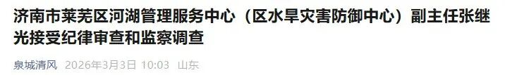 據萊蕪區紀委監委消息:濟南市萊蕪區河湖管理服務中心(區水旱災害防御中心)副主任張繼光涉嫌嚴重違紀違法,目前正接受濟南市萊蕪區紀委監委紀律審查和監察調查。