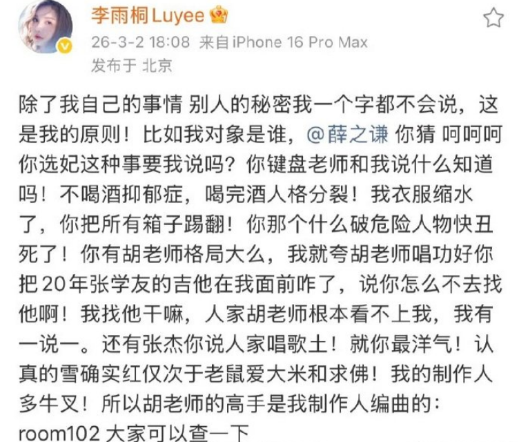 據(jù)了解,李雨桐爆料薛之謙私下評(píng)價(jià)張杰“唱歌土”,進(jìn)一步激化矛盾。