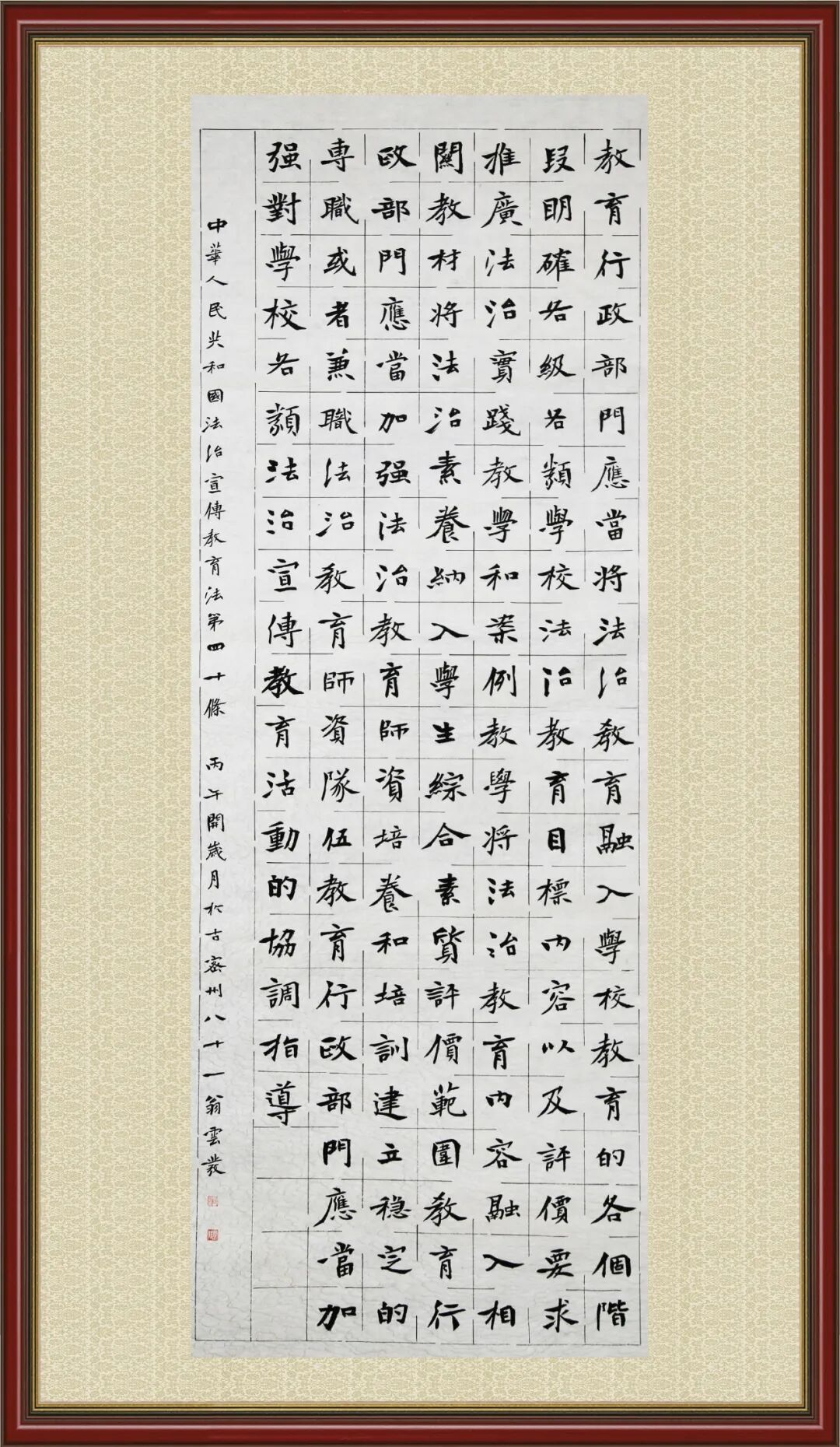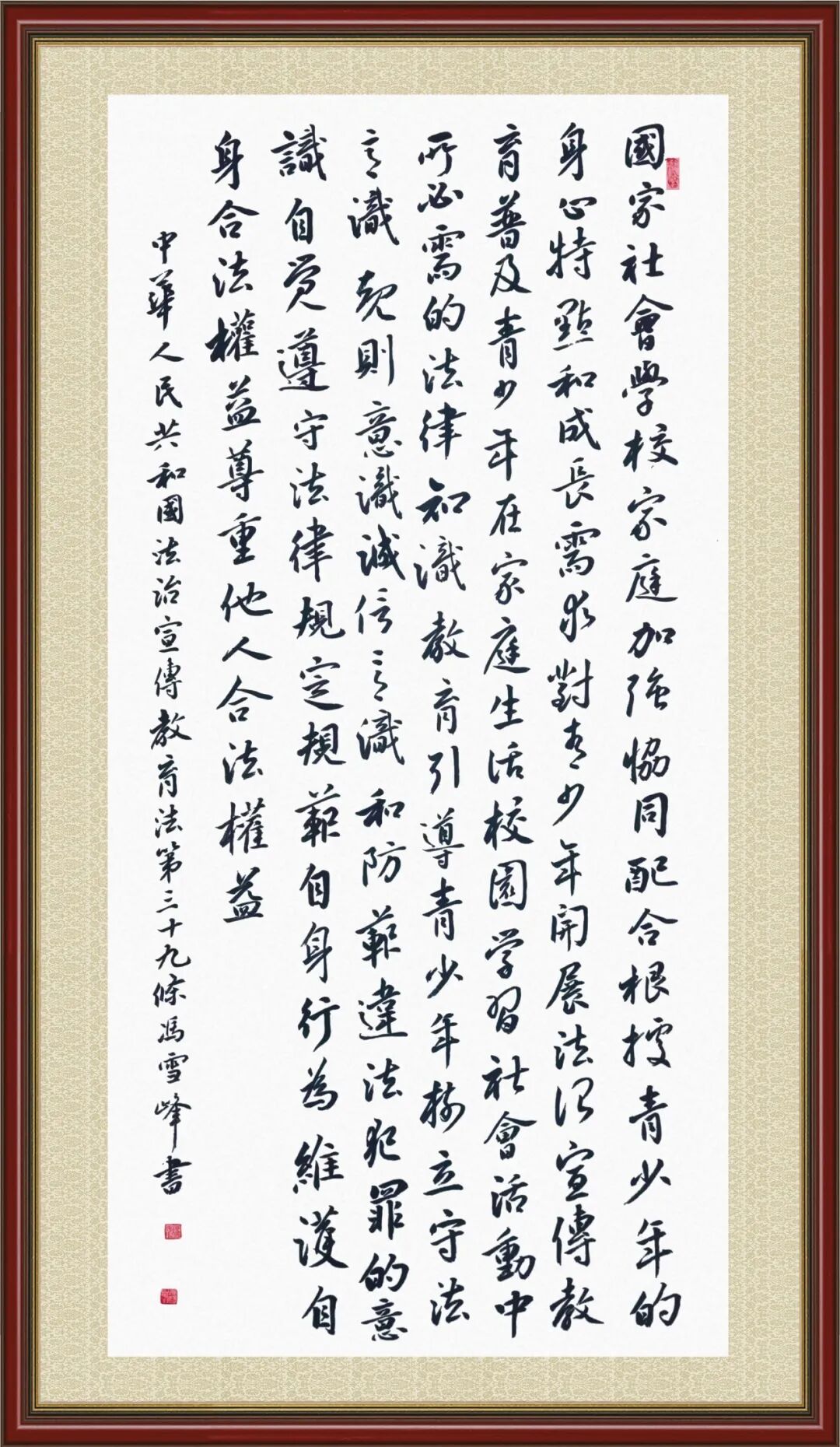 《中華人民共和國法治宣傳教育法》自2025年11月1日起開始施行。法治宣傳教育是全面依法治國的長期基礎性工作。法治宣傳教育法對提升全民法治素養和社會治理法治化水平、推動建設更高水平的社會主義法治國家具有重要意義。為更好地學習、宣傳、貫徹這部法律,法治日報社聯合司法部普法與依法治理局,開展了“‘書·法’系列活動之書寫《中華人民共和國法治宣傳教育法》”活動。