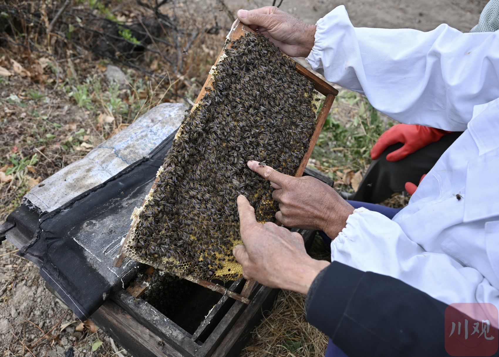 蜂農(nóng)查看蜂王狀態(tài)。