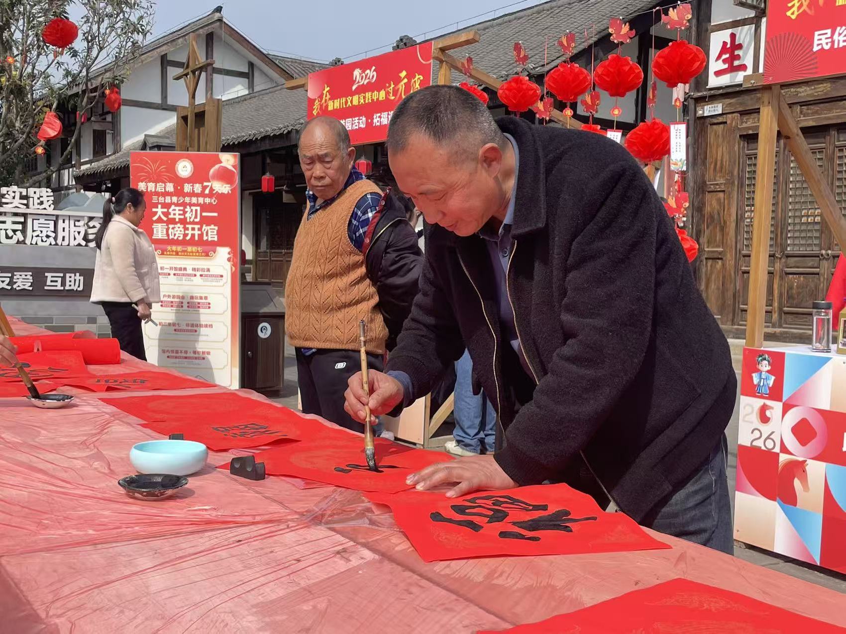 在潼川古城,“風新三臺 樂享元宵”主題游園活動正熱鬧開場。市民游客既能挑戰智力猜燈謎,也能參與“本草接福”健康問答、“平安知守”普法問答等活動。最受歡迎的當屬互動體驗區——市民可現場煮一碗湯圓、寫一個“福”字、體驗傳統拓印,把節日的暖意與祝福帶回家。