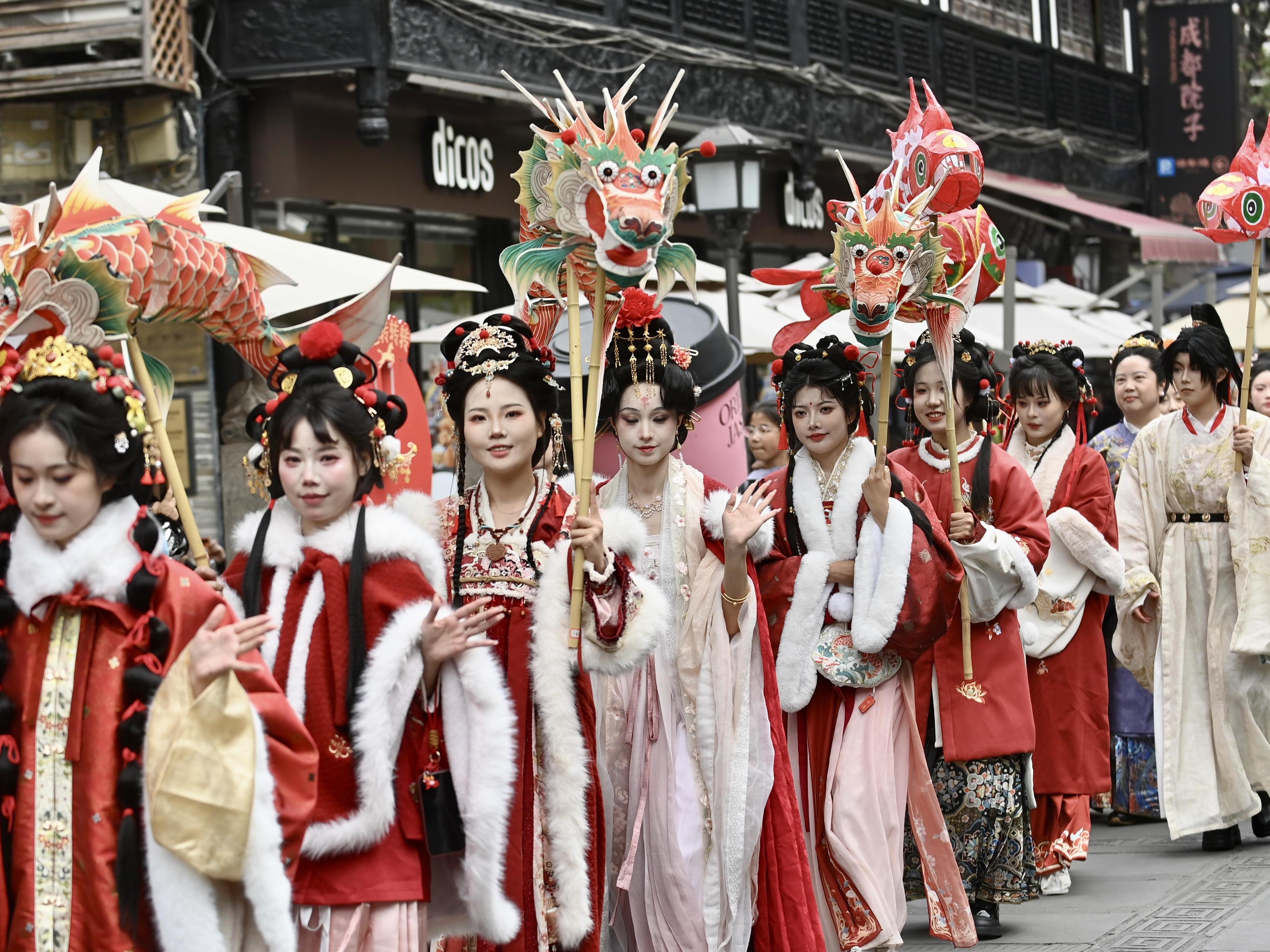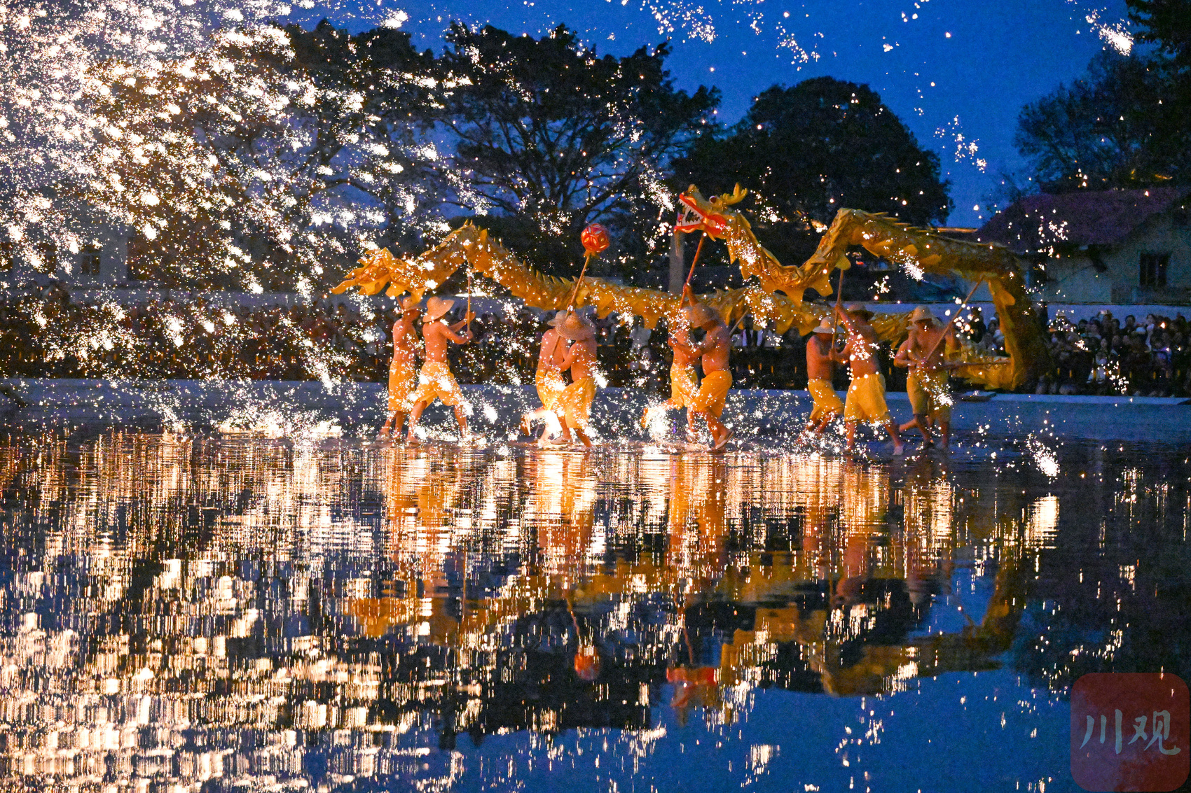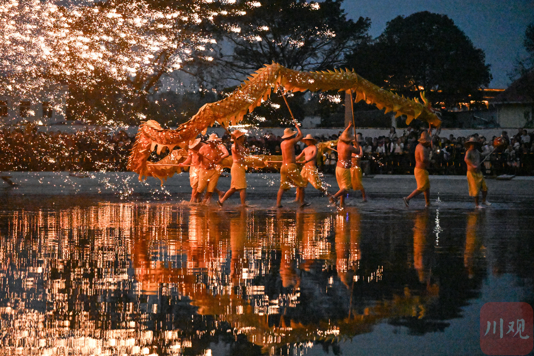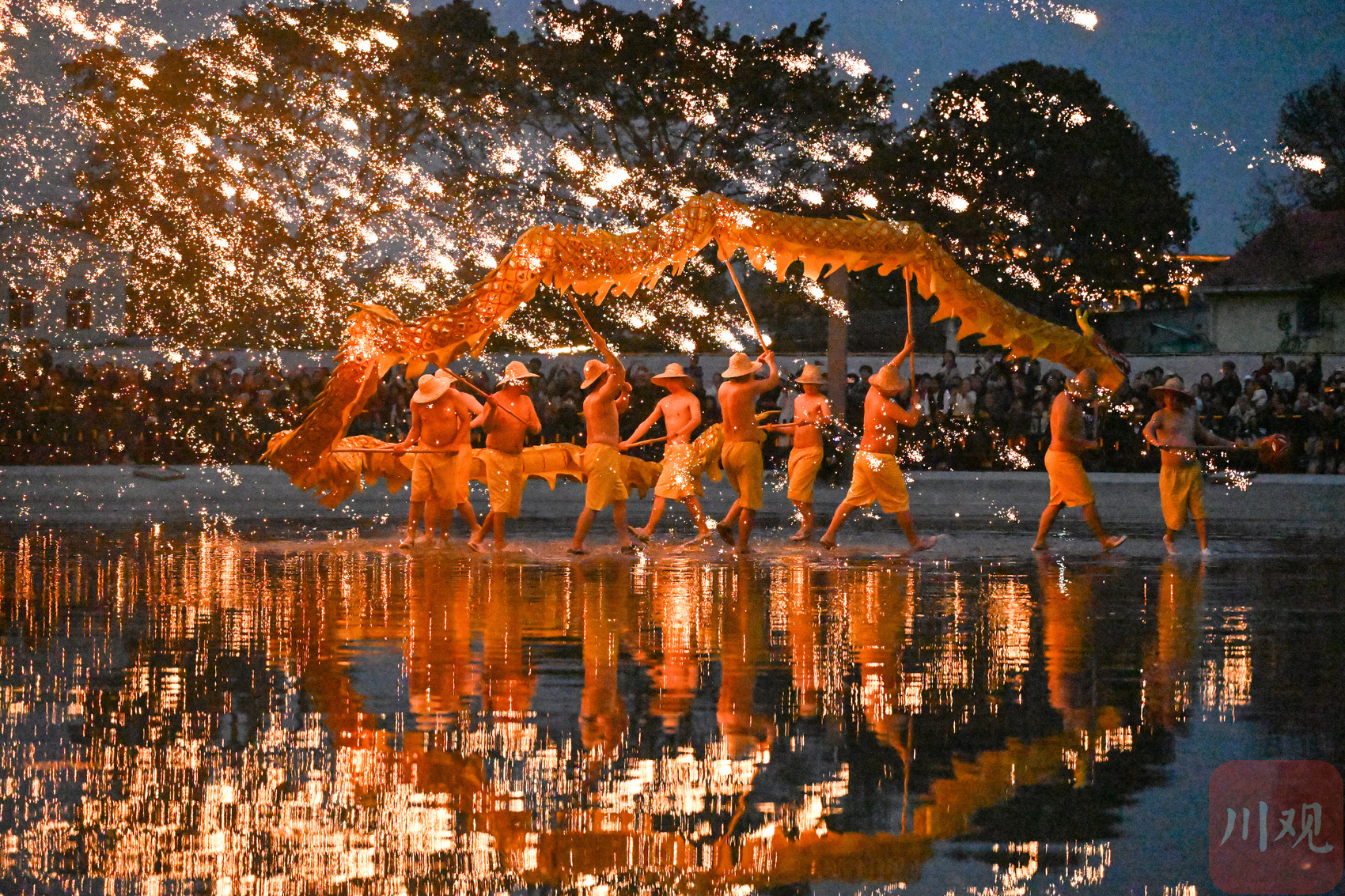 2026年3月3日晚,在四川省成都市雙流區黃龍溪古鎮,民間藝人為游客表演非遺“火龍燈舞”。