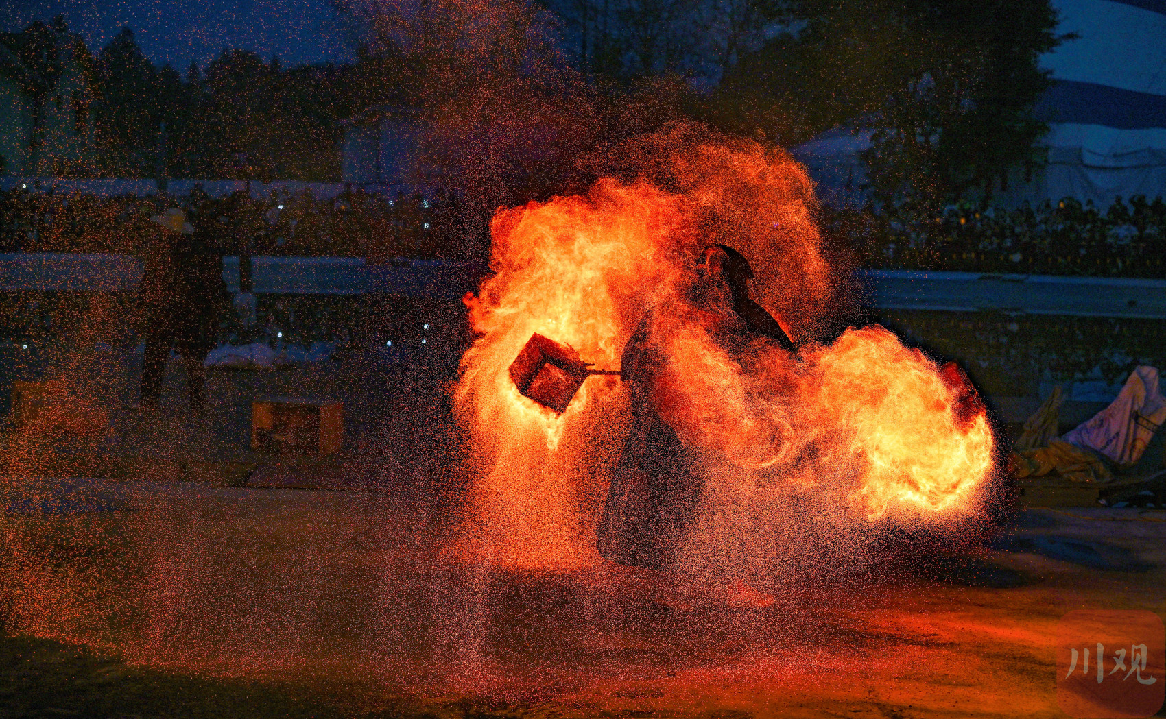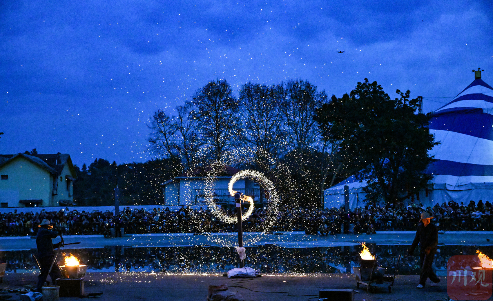 2026年3月3日晚,在四川省成都市雙流區黃龍溪古鎮,民間藝人為游客表演風火輪。