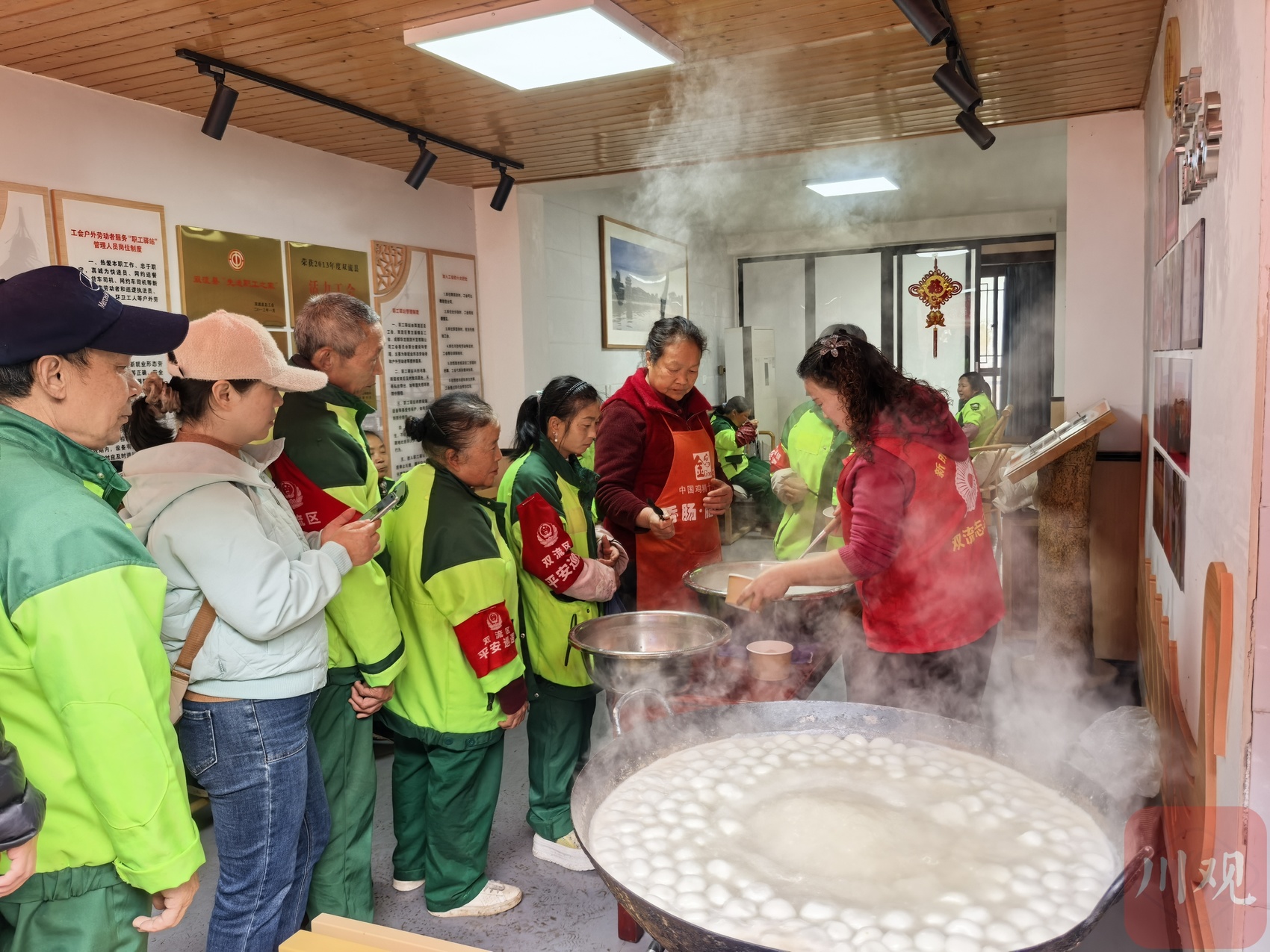 2026年3月3日,在成都市雙流區黃龍溪古鎮工會老碼頭驛站內,工作人員排隊領取湯圓。