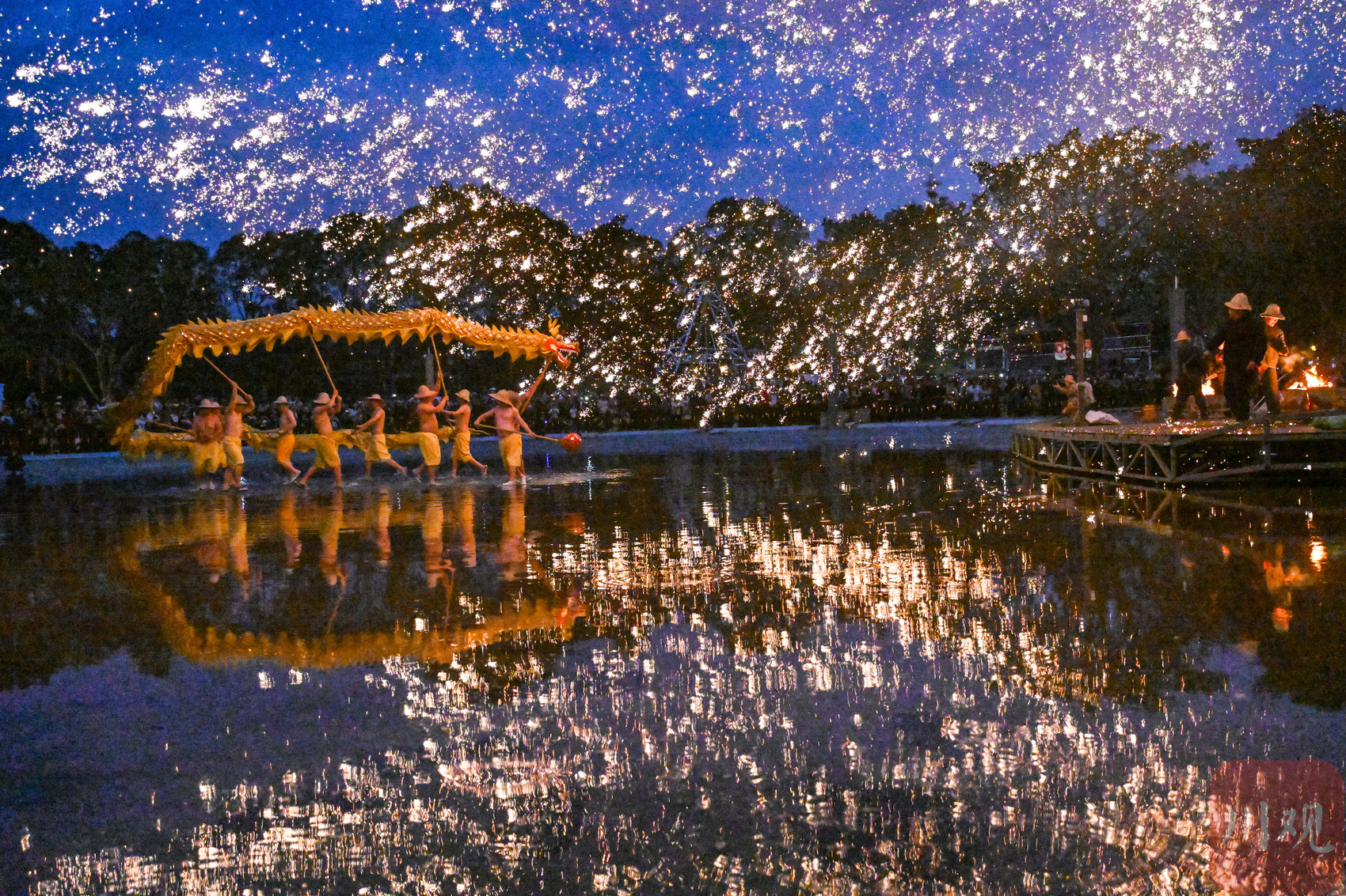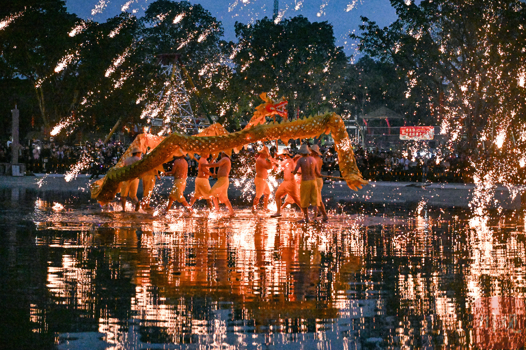 當晚,將活動推向高潮的是國家級非物質文化遺產——“火龍燈舞”表演。璀璨夜空下,匠人將熔化的鐵水奮力擊打,瞬間鐵花如星河濺落,絢麗奪目。舞龍者則在漫天“流星火雨”中穿梭翻騰,龍姿矯健,氣勢如虹。鼓點激昂,龍火共舞,這一集龍、燈、舞、火于一體的古老技藝,吸引了大量市民游客駐足驚嘆,讓人在震撼的視聽盛宴中,深刻感受到中華傳統文化的博大精深與元宵佳節的喜慶祥和。
