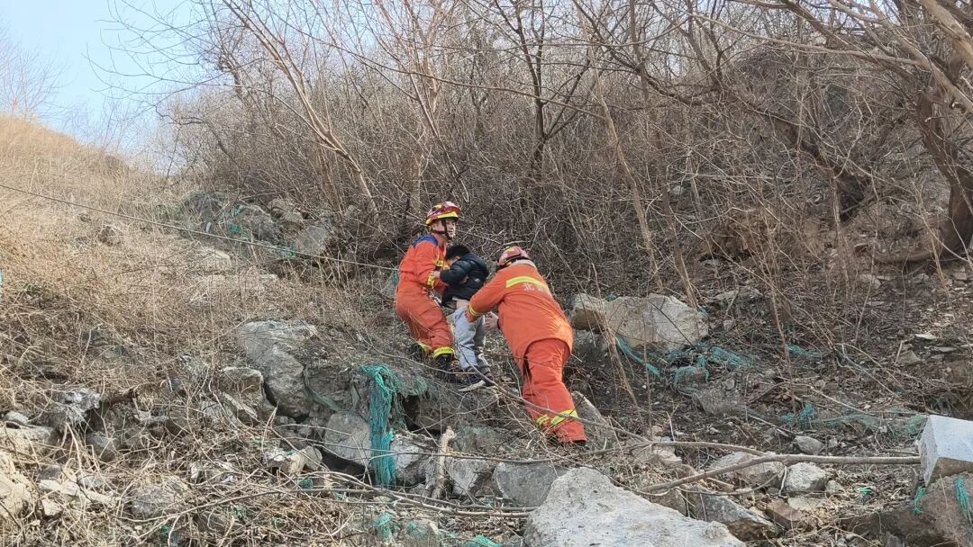 3月3日,正值農歷正月十五元宵節,在門頭溝區一處野山上,一位爸爸帶著自己兩歲、四歲倆孩子爬山賞景,不料誤入險境,被困在陡峭的半山腰,進退兩難。消防員利用繩索搭建救援通道,成功將父子三人營救下山。