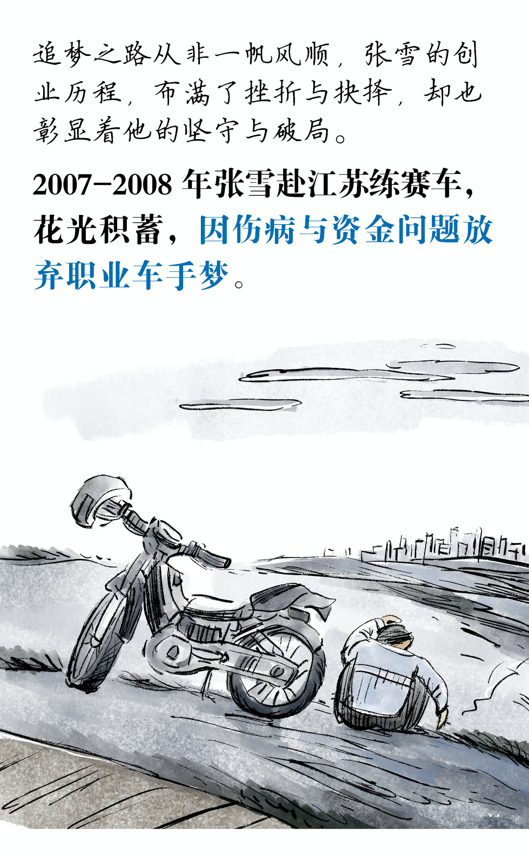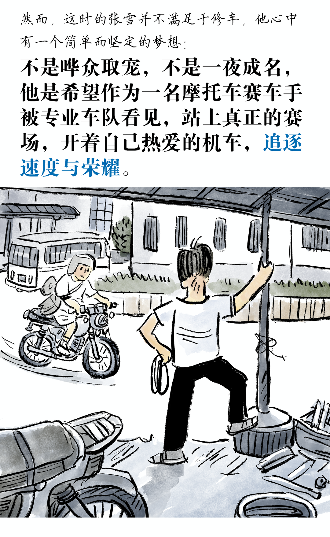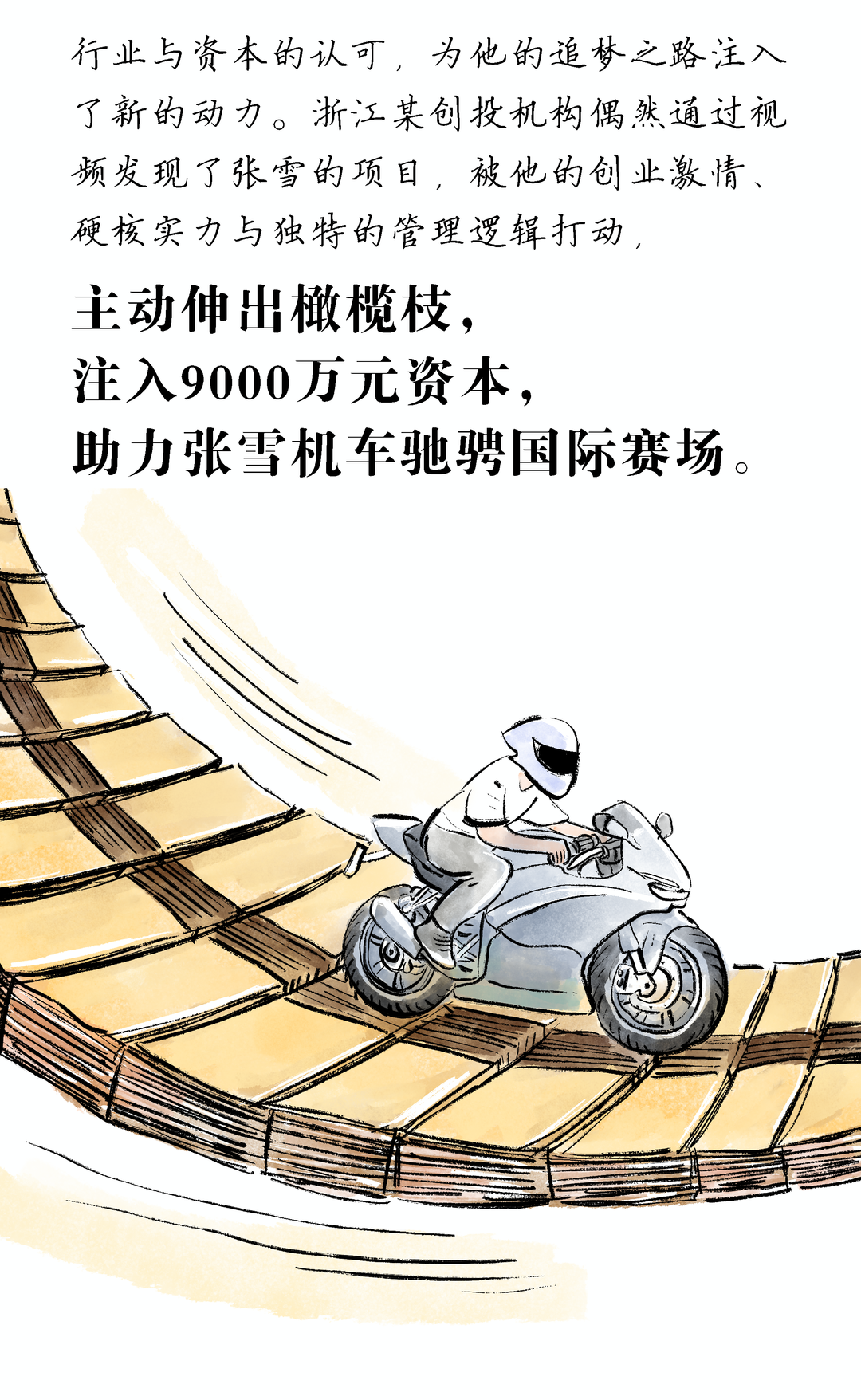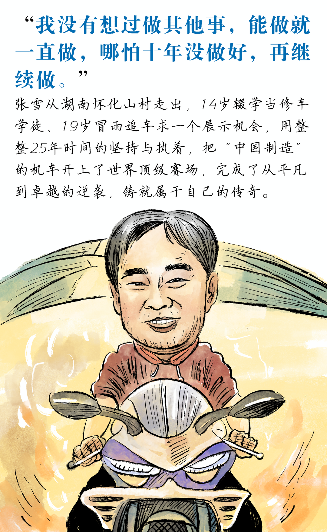 從湖南麻陽的貧瘠山村出發,10歲扛起生活重擔,14歲輟學與油污為伴,19歲冒雨狂奔百里只為一個追夢機會,張雪的人生從無坦途,卻始終被心底對機車的熱愛照亮。他在泥濘沙洲上苦練車技,在創業低谷中堅守核心技術,哪怕散盡積蓄、屢遭挫折,也從未放下對賽場與中國制造的執念。二十五年風雨兼程,他從滿身傷痕的草根少年,成長為打破國際豪強壟斷、讓中國機車登頂世界頂級賽場的創造者,用孤注一擲的執著、腳踏實地的深耕,書寫了平凡人逐夢不凡的傳奇。讓每一步奔赴都意義非凡,人間值得,夢想終會開花。