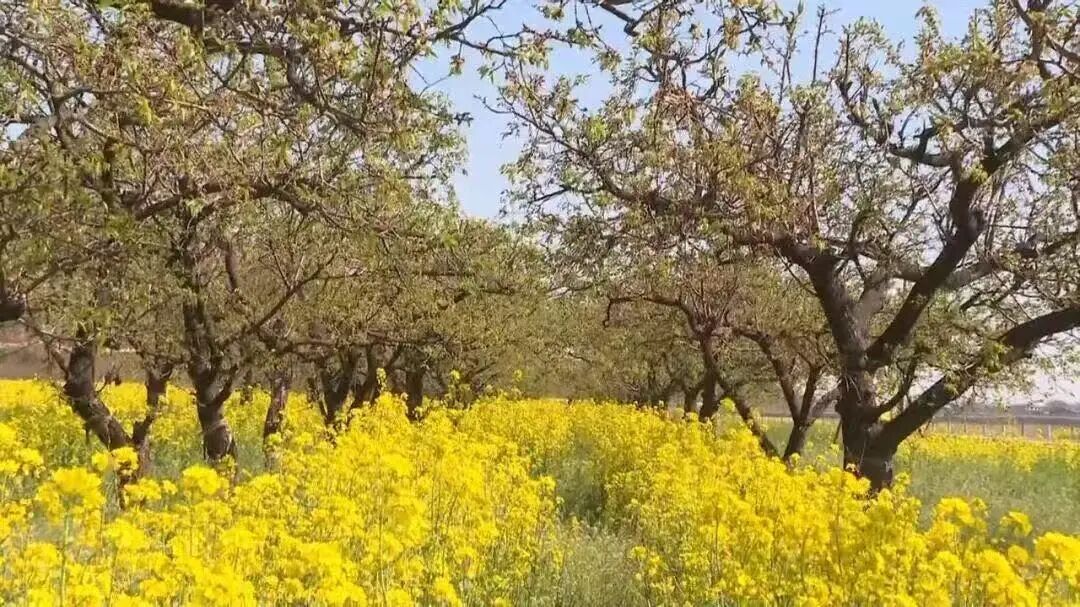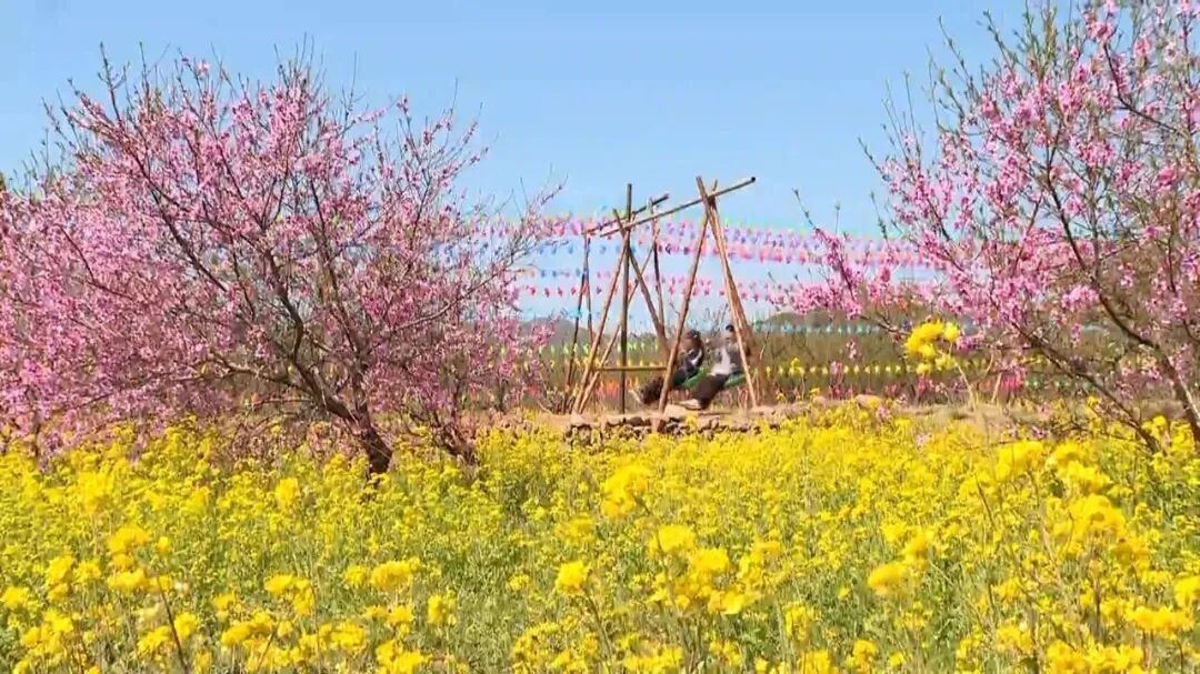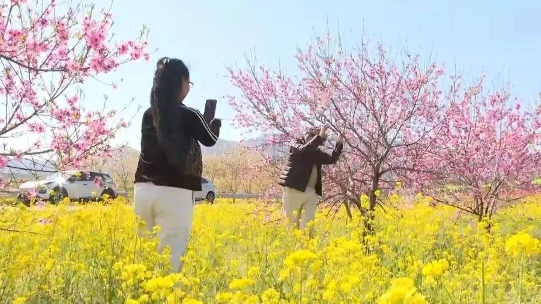 油菜花在春風中翻涌,層層疊疊的花海與連片的桃樹、杏樹交相輝映,金黃與粉白相互交織,勾勒出一幅生機盎然的春日田園畫卷。微風拂過,花香四溢,吸引了蜜蜂、蝴蝶縈繞其間。隨處可見三兩游客結伴游覽,拍照打卡,定格春日美好瞬間。