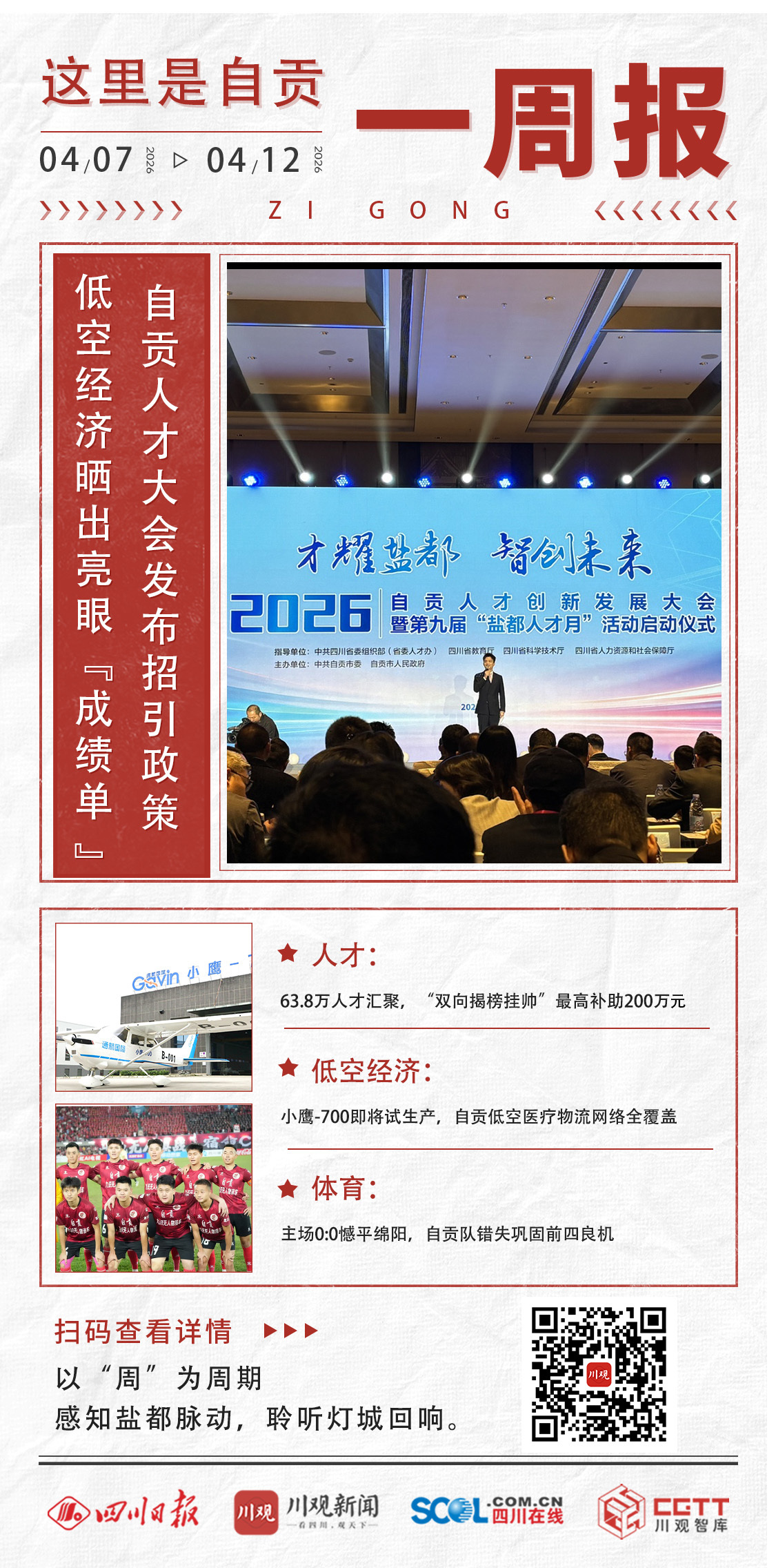本周(4月7日—4月12日),2026自貢人才創新發展大會暨第九屆“鹽都人才月”活動啟動。大會現場發布“雙向揭榜掛帥”政策,推介產業轉型升級引導基金,全市人才總量已達63.8萬人。與此同時,自貢航空產業園曬出低空經濟“成績單”:國產小鷹-700即將試生產,低空醫療無人機累計飛行超6000架次。川超賽場上,自貢燈城燊龍隊主場0:0憾平綿陽九洲長虹隊。此外,WCBA半決賽在富順舉行,單場賽事帶動經濟效益超800萬元;四川省醫院協會內部控制分會系列會議也在自貢召開。