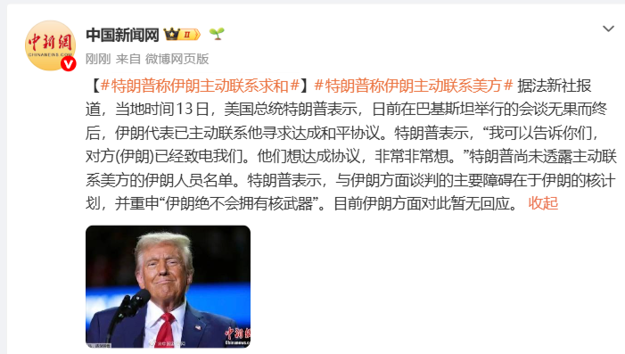據中國新聞網援引法新社報道、特朗普表示,“我可以告訴你們,對方(伊朗)已經致電我們。他們想達成協議,非常非常想。”特朗普尚未透露主動聯系美方的伊朗人員名單。特朗普表示,與伊朗方面談判的主要障礙在于伊朗的核計劃,并重申“伊朗絕不會擁有核武器”。目前伊朗方面對此暫無回應。