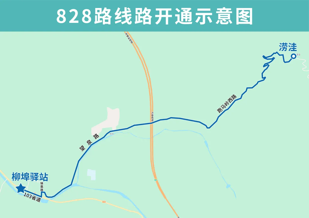 828路由柳埠驛站開往澇洼,主要途經103省道、望泉路、跑馬嶺西路,沿途設置柳埠驛站、柳埠大橋、柳埠西、柳埠東、柳埠一中、四季村、四門塔、凸凹村、拐把灣、大會村、李家塘、王家峪村、大峪村、玉水村、玉水村東、澇洼站點。