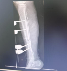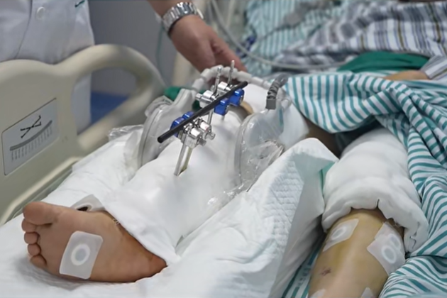 最后一步,就是固定骨骼,重建下肢力線。針對多項粉碎性骨折、骨缺損情況,手術團隊采用外固定支架臨時復位固定,既保證肢體形態,又為二期缺損的骨修復預留空間。