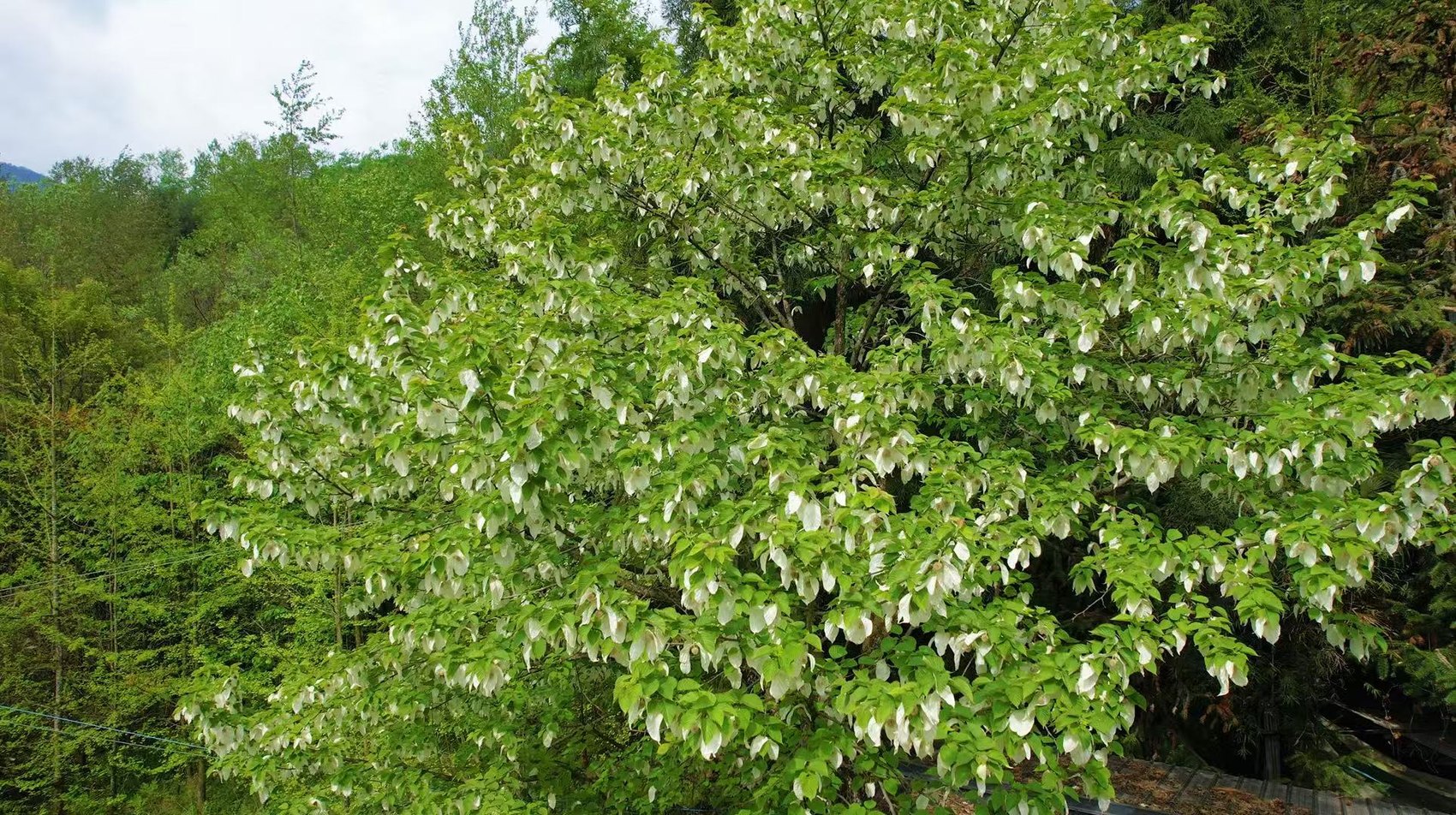 近日,四川綿陽安州區千佛鎮海拔1500米以上的山林中,野生珙桐進入盛花期。