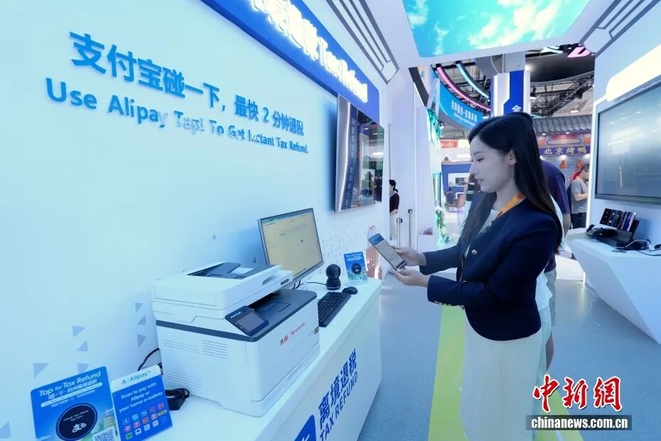 資料圖:2025年9月9日,北京首鋼園區(qū),一名媒體記者在2025年服貿(mào)會中國移動展臺體驗離境退稅服務(wù)。中新社記者 張祥毅 攝