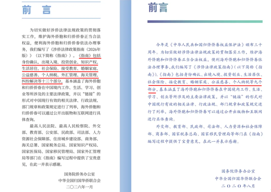 《涉僑法律政策指南(2026年版)》《涉僑法律政策指南(2020年版)》前言,新版《指南》新增了知識產(chǎn)權(quán)、外匯管理、海關(guān)管理、糾紛解決4個部分。