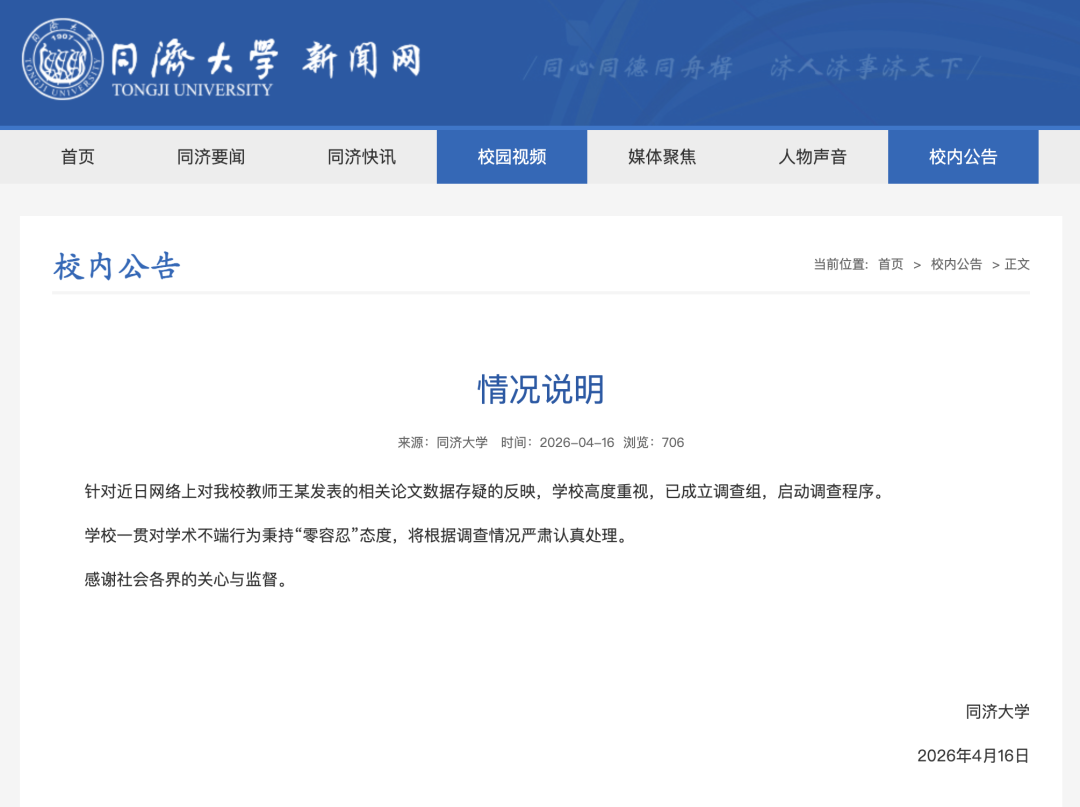 4月16日,同濟大學(xué)發(fā)布情況說明: