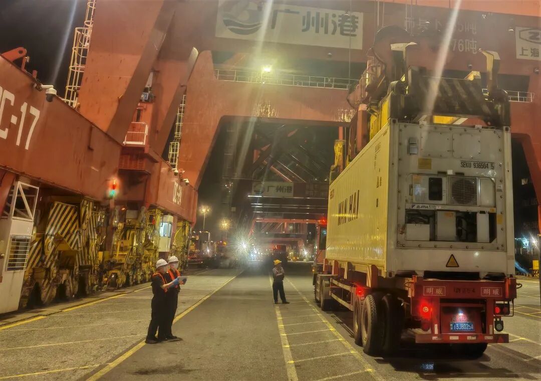 4月14日晚,廣州海關(guān)所屬南沙海關(guān)關(guān)員監(jiān)管裝載泰國(guó)榴蓮集裝箱卸船。