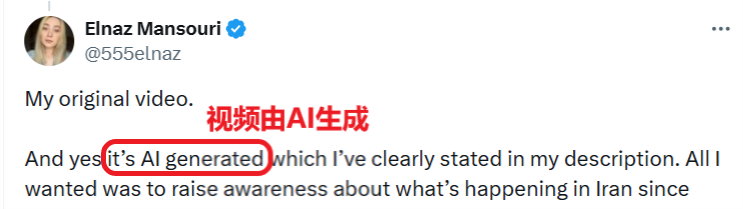 孟加拉國事實核查機構“謠言掃描”(Rumor Scanner)進一步追溯發現,原視頻最早于1月11日發布在海外社交平臺“照片墻”上。原帖已明確寫明,這是“受伊朗現實局勢啟發,用人工智能重建的場景”。法新社聯系創作者后,對方也證實,這段視頻系AI制作。