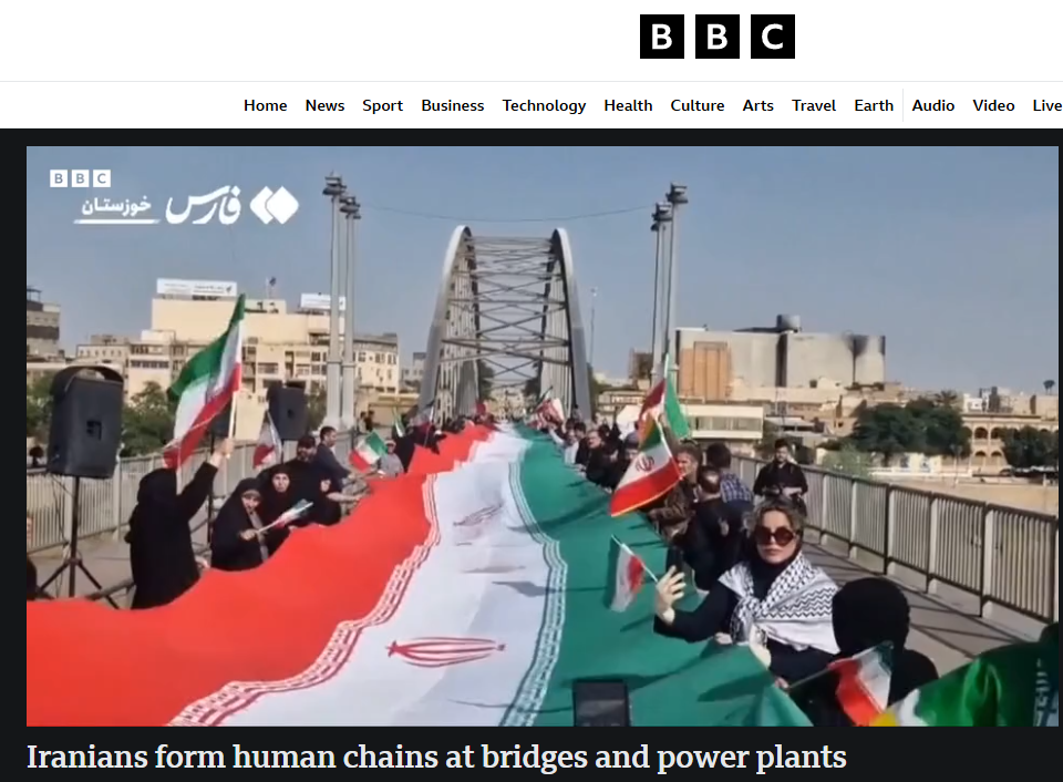 △英國廣播公司有關“伊朗民眾在橋梁和發電廠組成人鏈以保護本國關鍵設施”報道截圖