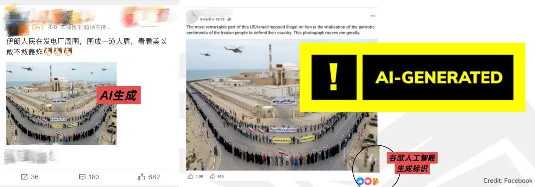 以上網傳的“伊朗民眾集結保護發電廠”視頻,不是真實現場,而是AI生成內容;而所謂“布什爾核電站外人鏈”圖片,也不是現場照片,同樣為AI制作。