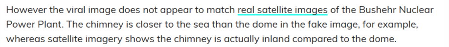 “完全事實”還將網傳圖片中的建筑布局與布什爾核電站的真實衛星圖進行了比對。結果發現,圖中煙囪、穹頂與海岸線之間的相對位置明顯不符,說明這并不是布什爾核電站的真實現場照片。