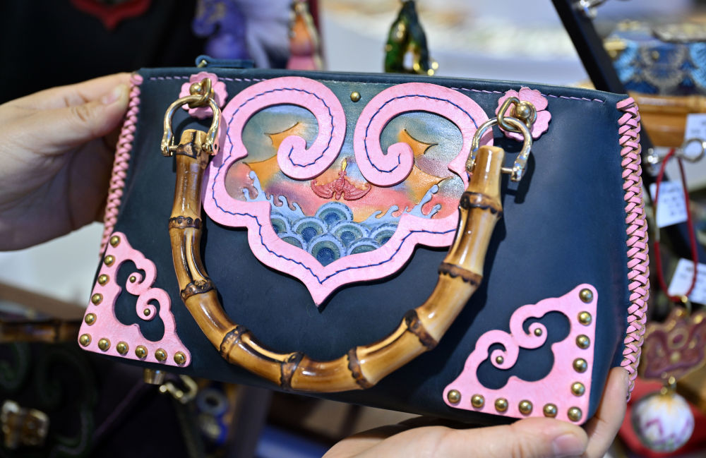 4月15日在第六屆消博會現場拍攝的一款非遺皮雕手提包。新華社記者 郭程 攝