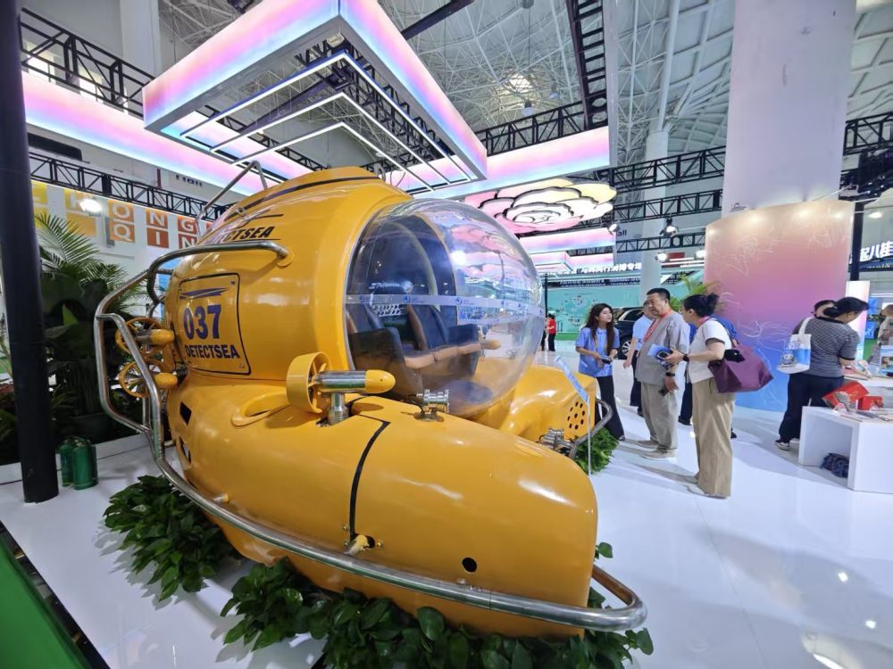 在國貨精品展區重慶館,一臺黃色潛水器“鮫子”成為現場觀眾的熱門打卡展品。這款民用載人觀光潛水器已經在三亞大東海景區、亞龍灣景區等投用,由純電力驅動,減少對海洋環境的污染。
