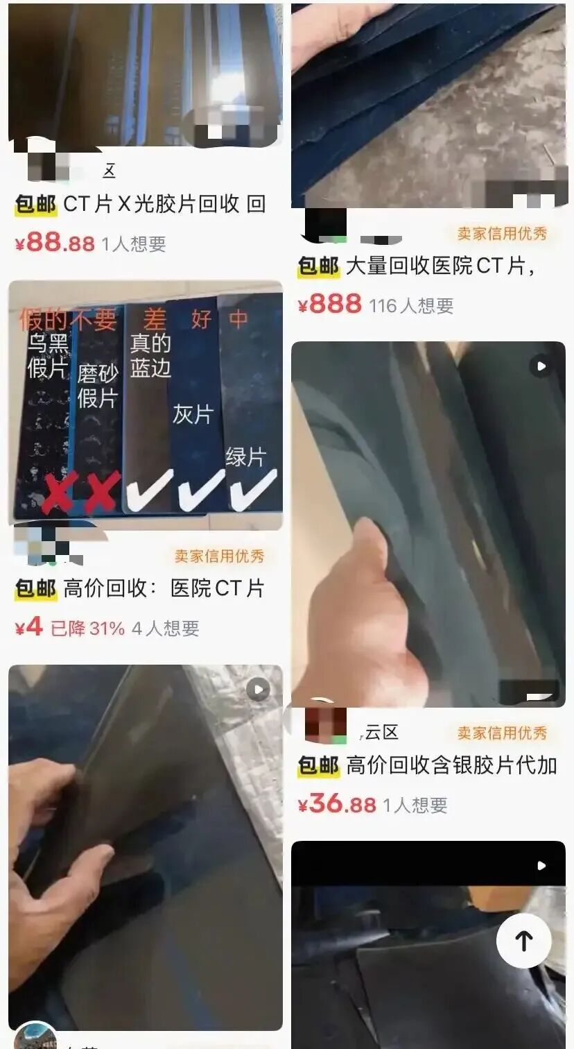 近期,在一些二手交易平臺上,出現了不少收購廢舊醫用膠片的信息。有人主動出售:“71張,200元包郵?!边@些原本記錄患者骨骼、器官影像的CT片、X光片,正在被買家批量收購。