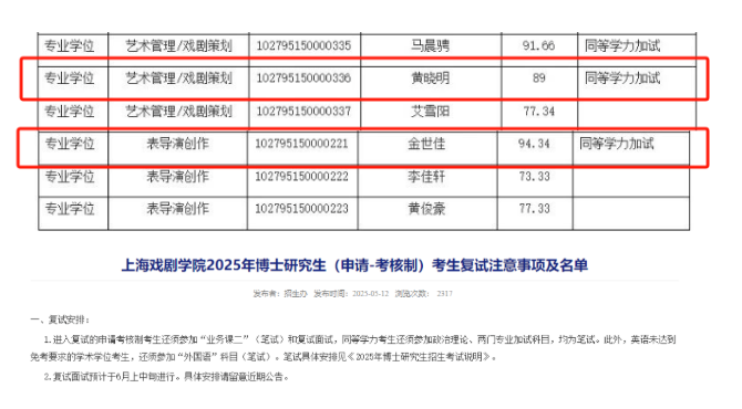 2025年5月12日,上海戲劇學院官方發(fā)布了2025年博士研究生的復試名單,有網友在名單中發(fā)現了黃曉明,這也意味著其已經通過了初試。