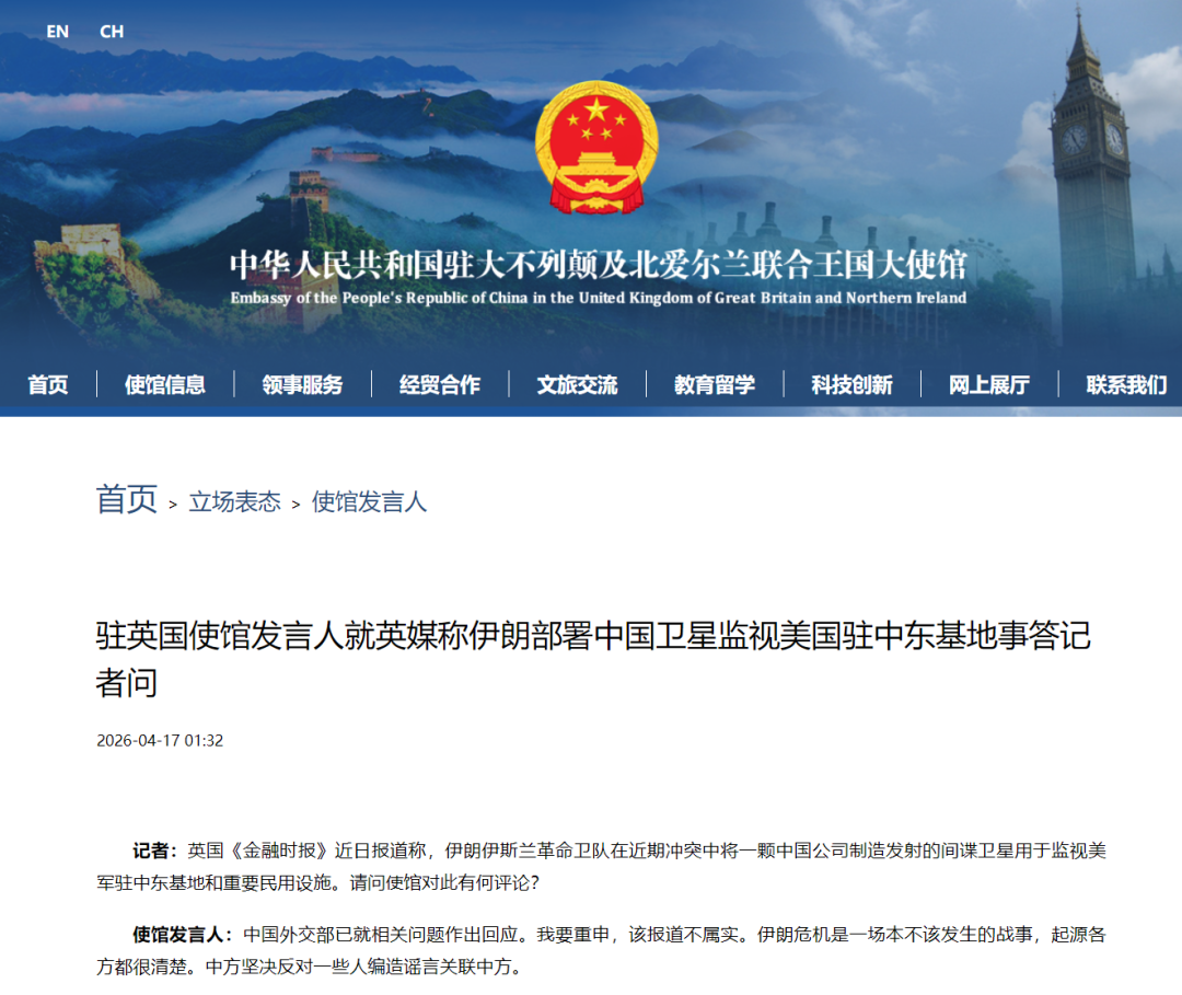 駐英國使館發言人就英媒稱伊朗部署中國衛星監視美國駐中東基地事答記者問