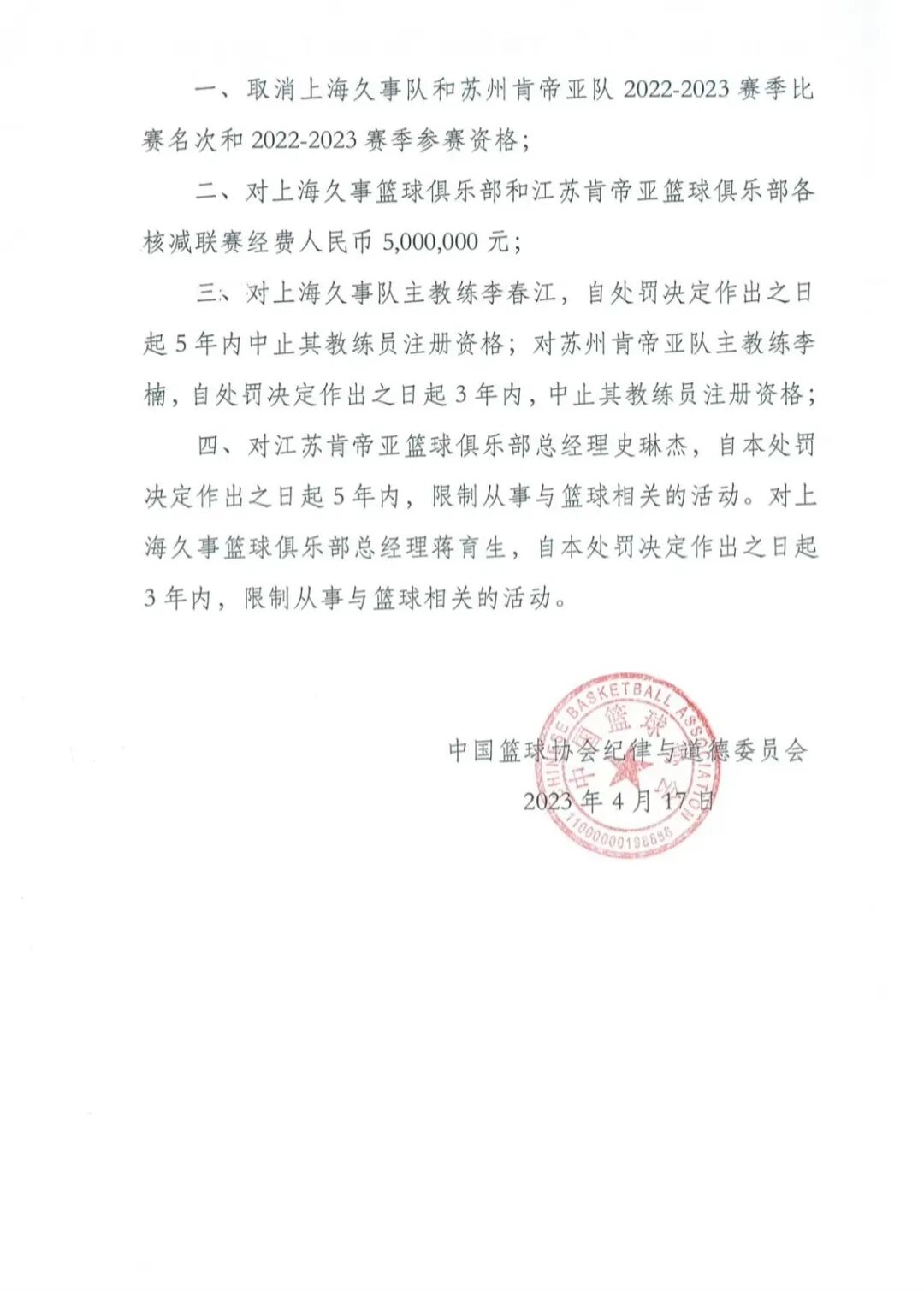 對(duì)江蘇肯帝亞籃球俱樂部總經(jīng)理史琳杰,自本處罰決定作出之日起5年內(nèi),限制從事與籃球相關(guān)的活動(dòng);對(duì)上海久事籃球俱樂部總經(jīng)理蔣育生,自本處罰決定作出之日起3年內(nèi),限制從事與籃球相關(guān)的活動(dòng)。
