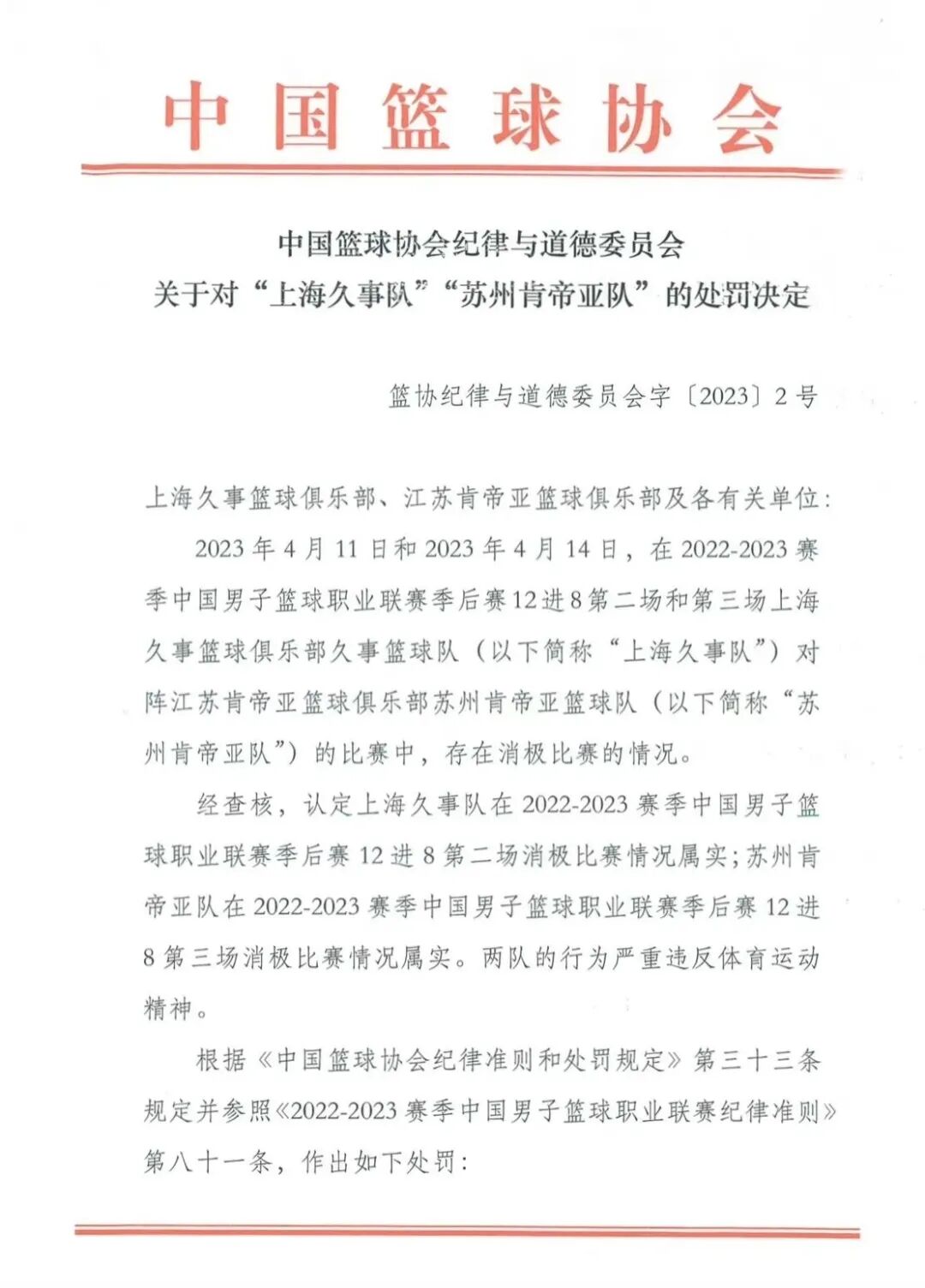據(jù)央視新聞,2023年4月17日,中國(guó)籃協(xié)發(fā)布關(guān)于上海久事男籃對(duì)陣蘇州肯帝亞男籃比賽的處罰決定: